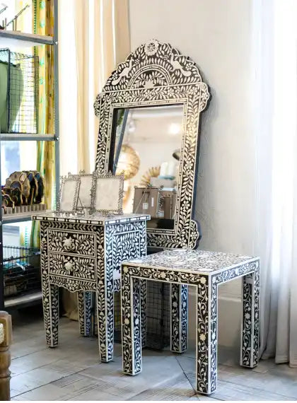 Bone inlay is the art of extreme detail, mastered in Rajasthan. However, this art is now recognized worldwide for its artistic skills incorporated on furniture pieces like chest of drawers, sideboards, and coffee tables. Luxury Handicrafts is a prominent bone inlay furniture store offering a premium collection in numerous color choices of black, blue, white and more.