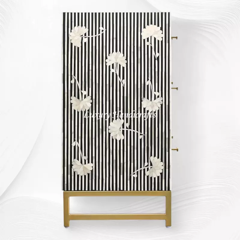 Floral Motif Bone Inlay is the timeless jewel in our Inlay Furniture and Accessories Collection. The gorgeous combination of Grey and white has everlasting appeal and creates a relaxed bohemian elegance in your home. This versatile chest of drawers can be used in a living room, bedroom, entry or hallway.