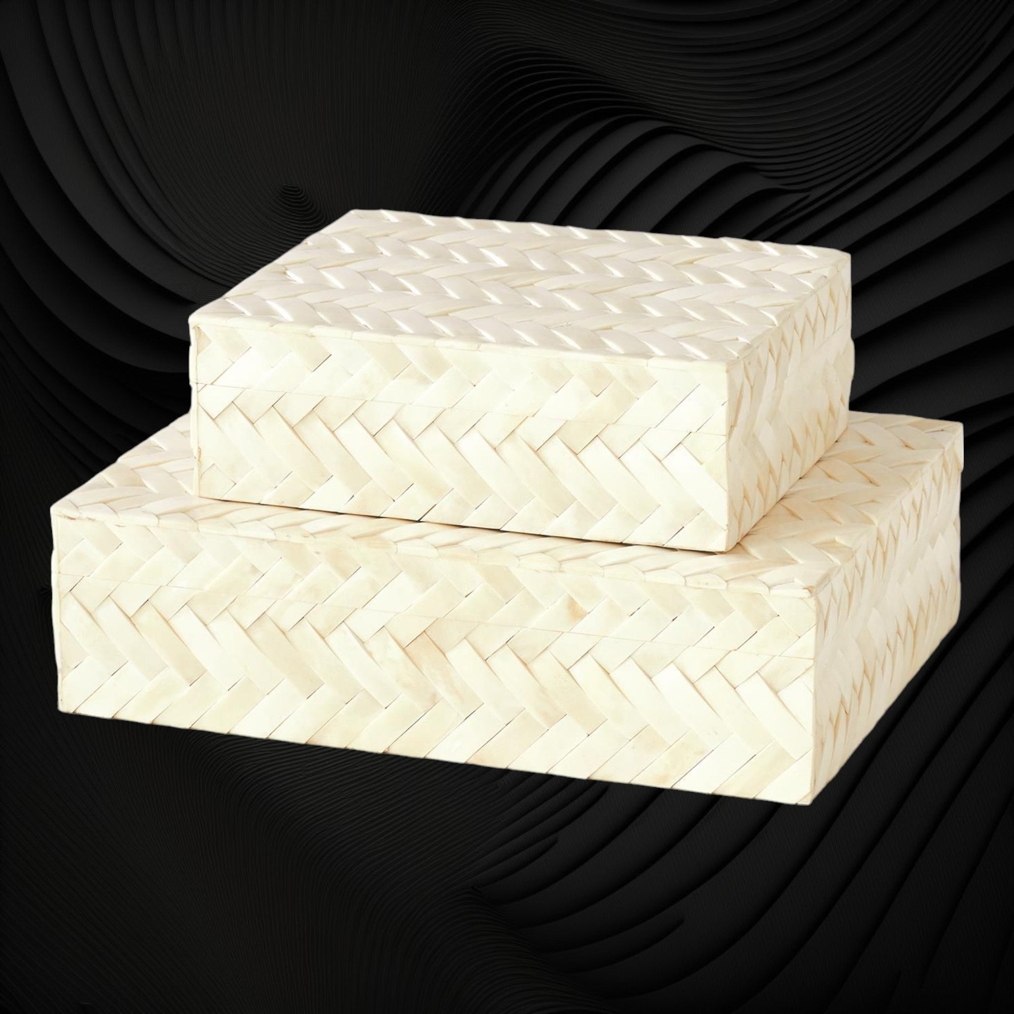 Entirely hand-made, our white bone braided boxes are noted by both strength and beauty. Lovely buffalo bone is carefully applied over the outer surface resulting in objects that will stand the test of time. Available in two sizes.