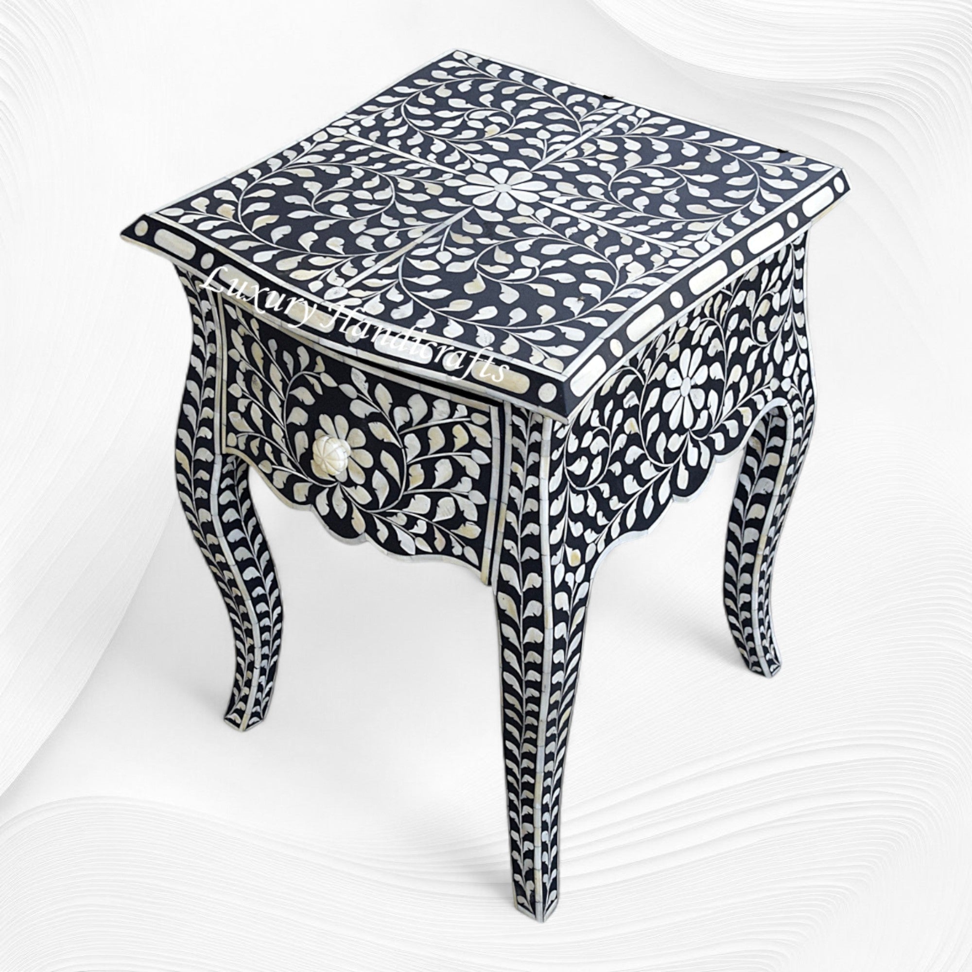 Handcrafted in the traditional manner at Luxury Handicrafts, our Bone Inlay nightstands celebrates the ancient art of bone inlay. This Side table / Nightstand features 1 drawer and graceful cabriole legs