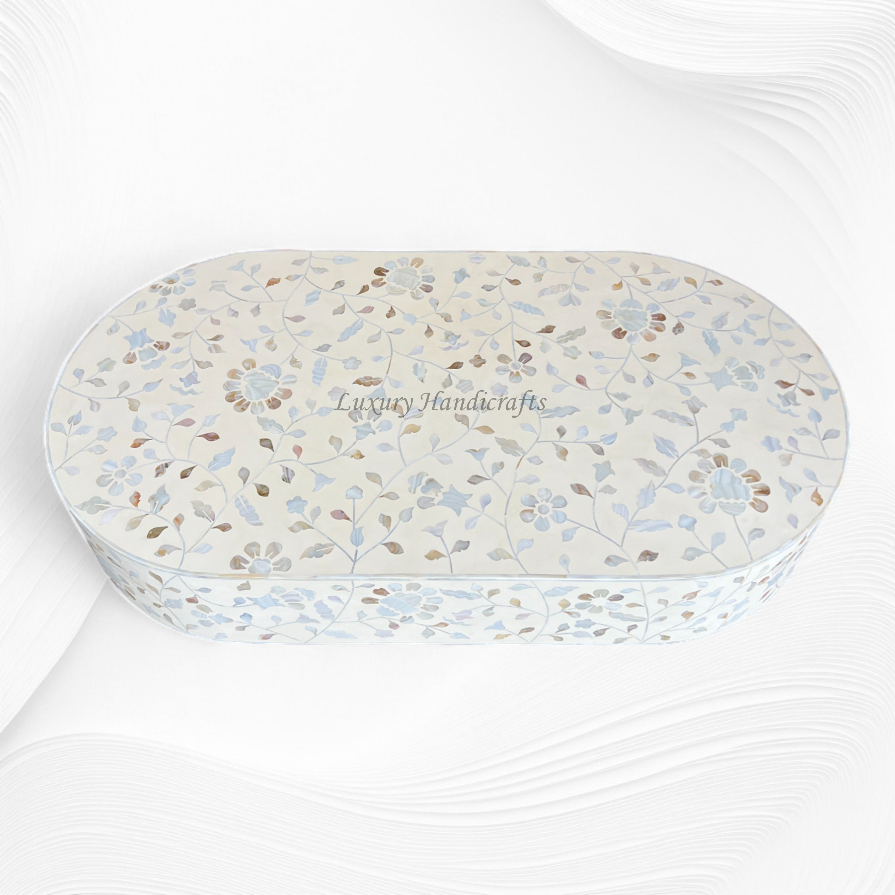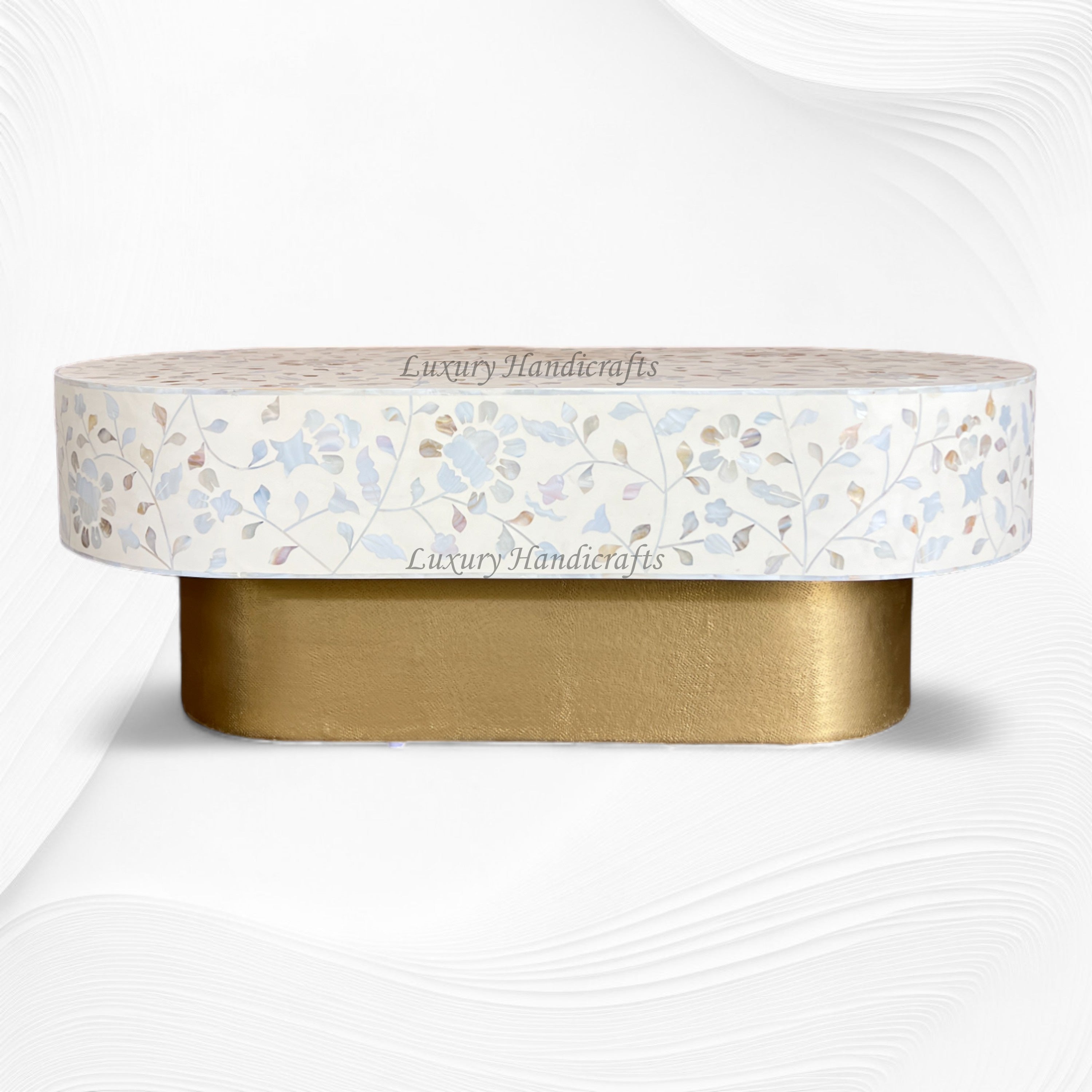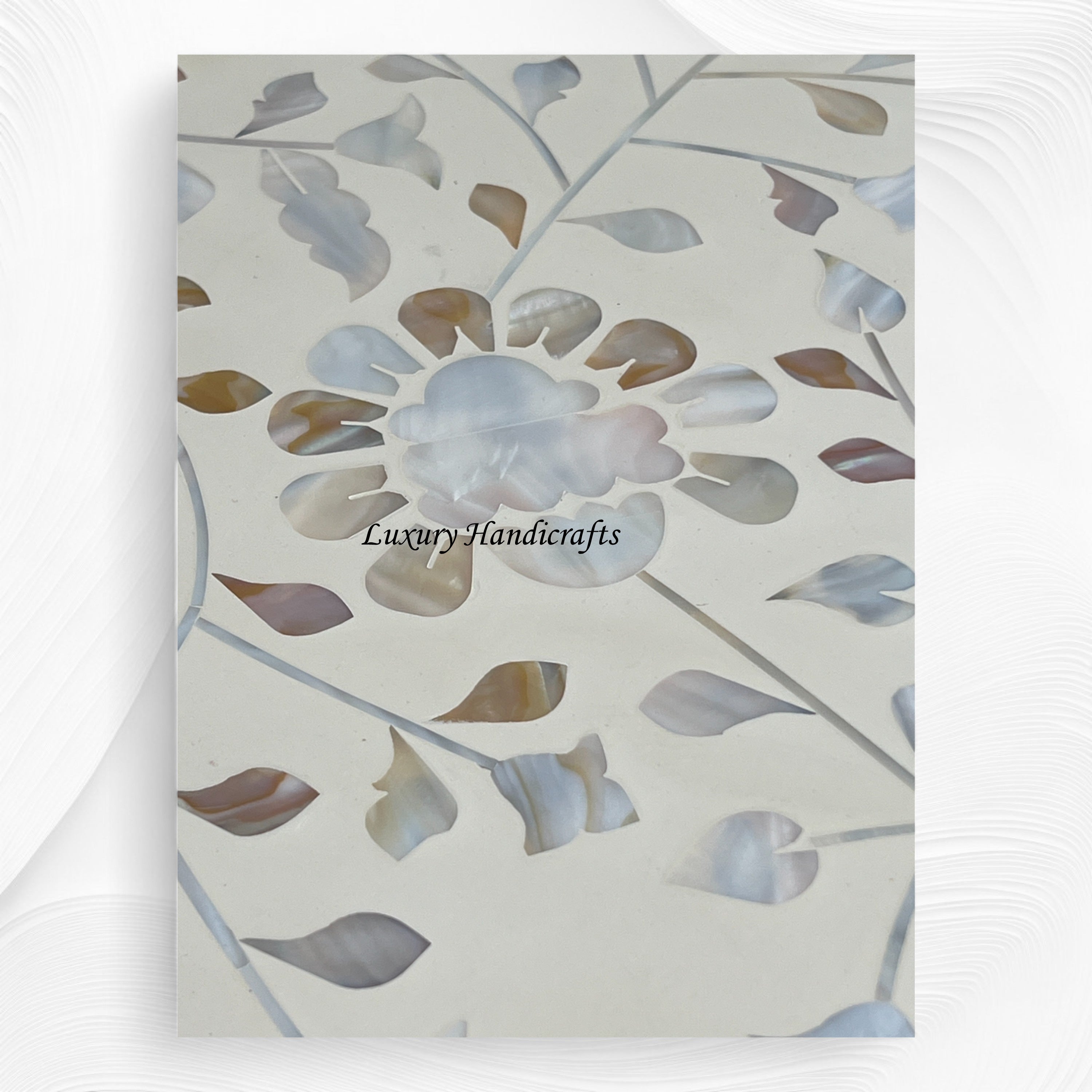 A show stopper piece, completely handmade with Flowers in all designs. This beige coffee table is one of the top picks ! This table features intricate floral patterns meticulously handcrafted using mop inlay techniques, creating a beautiful contrast against the sleek black background. The floral motif adds a touch of elegance and sophistication to any room, making it a focal point of your décor.