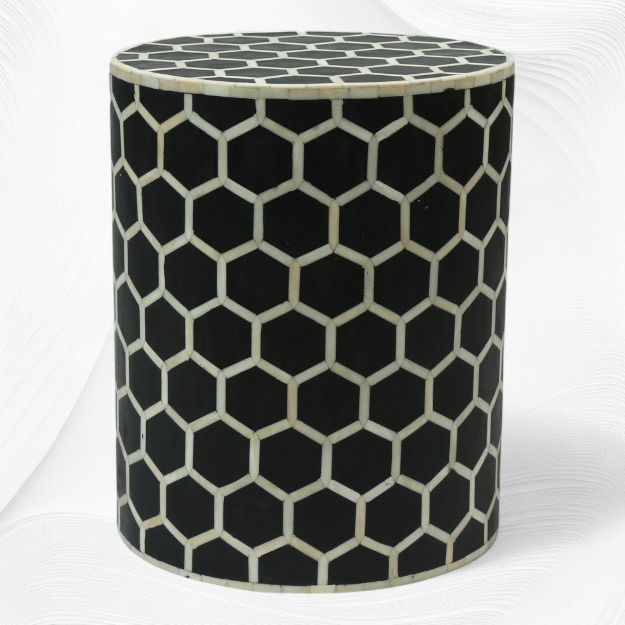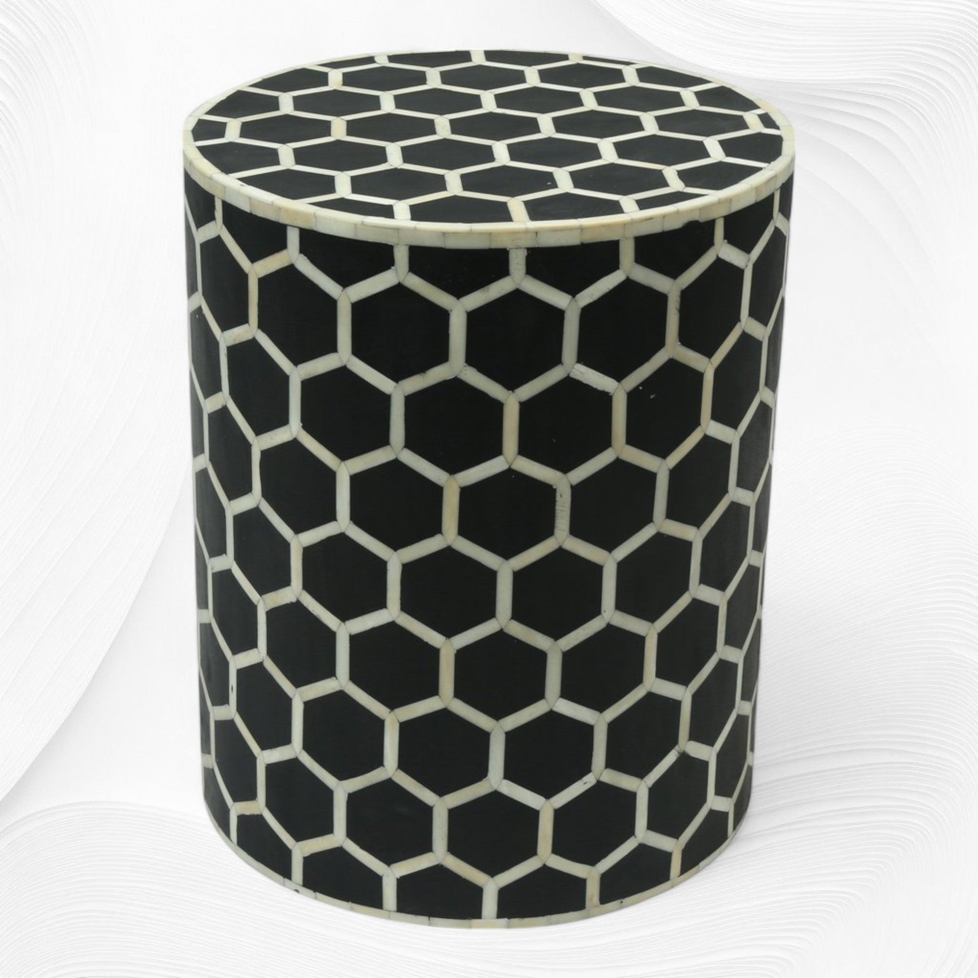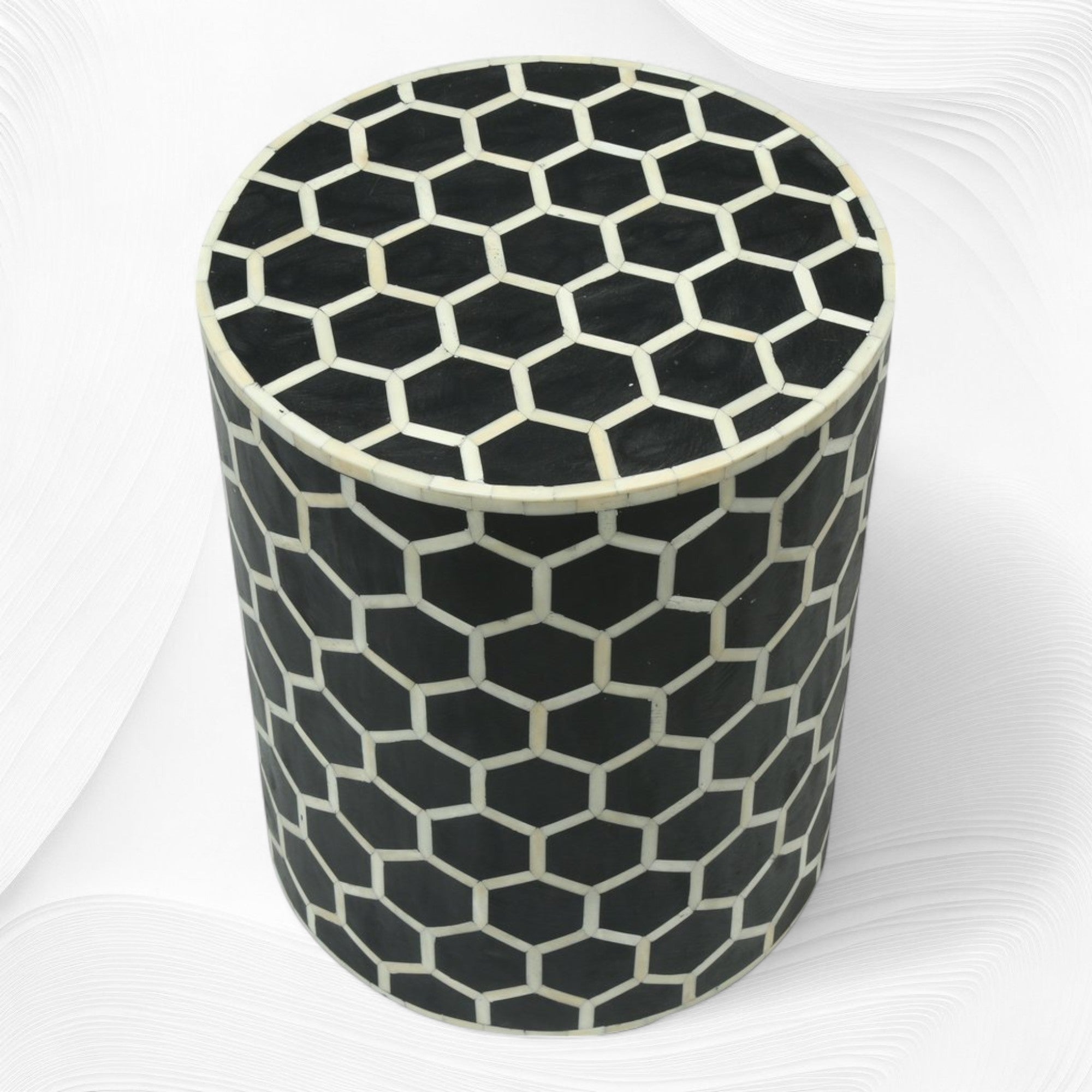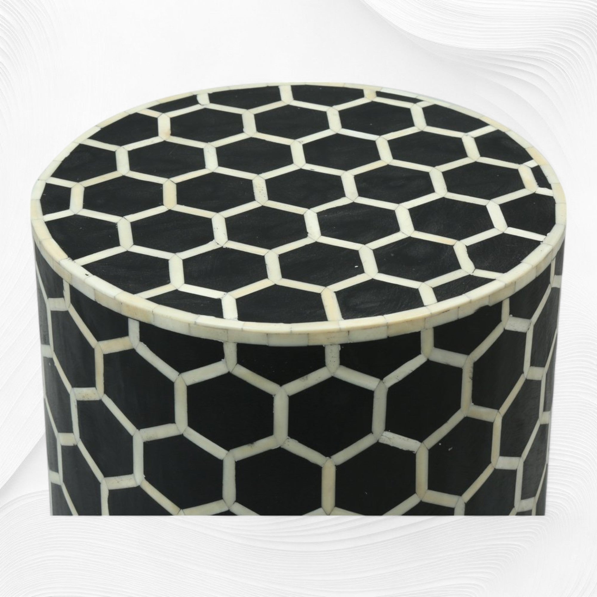 Our Bone Inlaid Round Side Table is inlaid by hand to create an intricate honeycomb pattern. On top of that, we added black color to smooth things out, making it an ideal spot to rest a drink, a book or both.