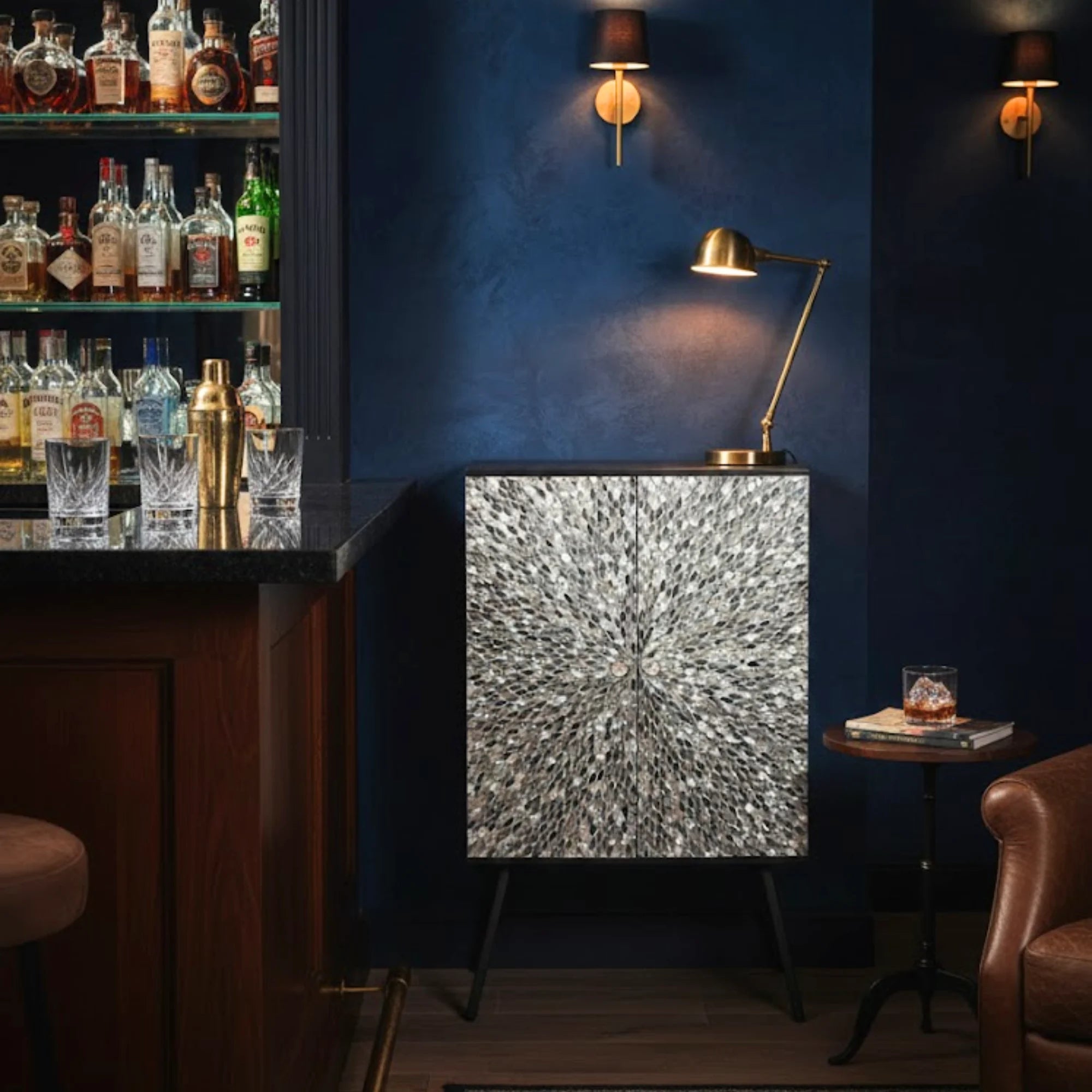 Featuring an ornately decorative and strikingly leaf-shaped motif with intricately inlaid pieces, this gorgeous bar cabinet offers both storage and style. Its elegant craftsmanship highlights fine detailing, making it a standout addition to any living space. The smooth finish enhances the natural beauty of the materials, while the thoughtfully designed compartments provide practical storage for everyday essentials. Perfect for blending functionality with artistic charm, this cabinet complements both modern and traditional interiors, serving as a statement piece that elevates the overall décor.