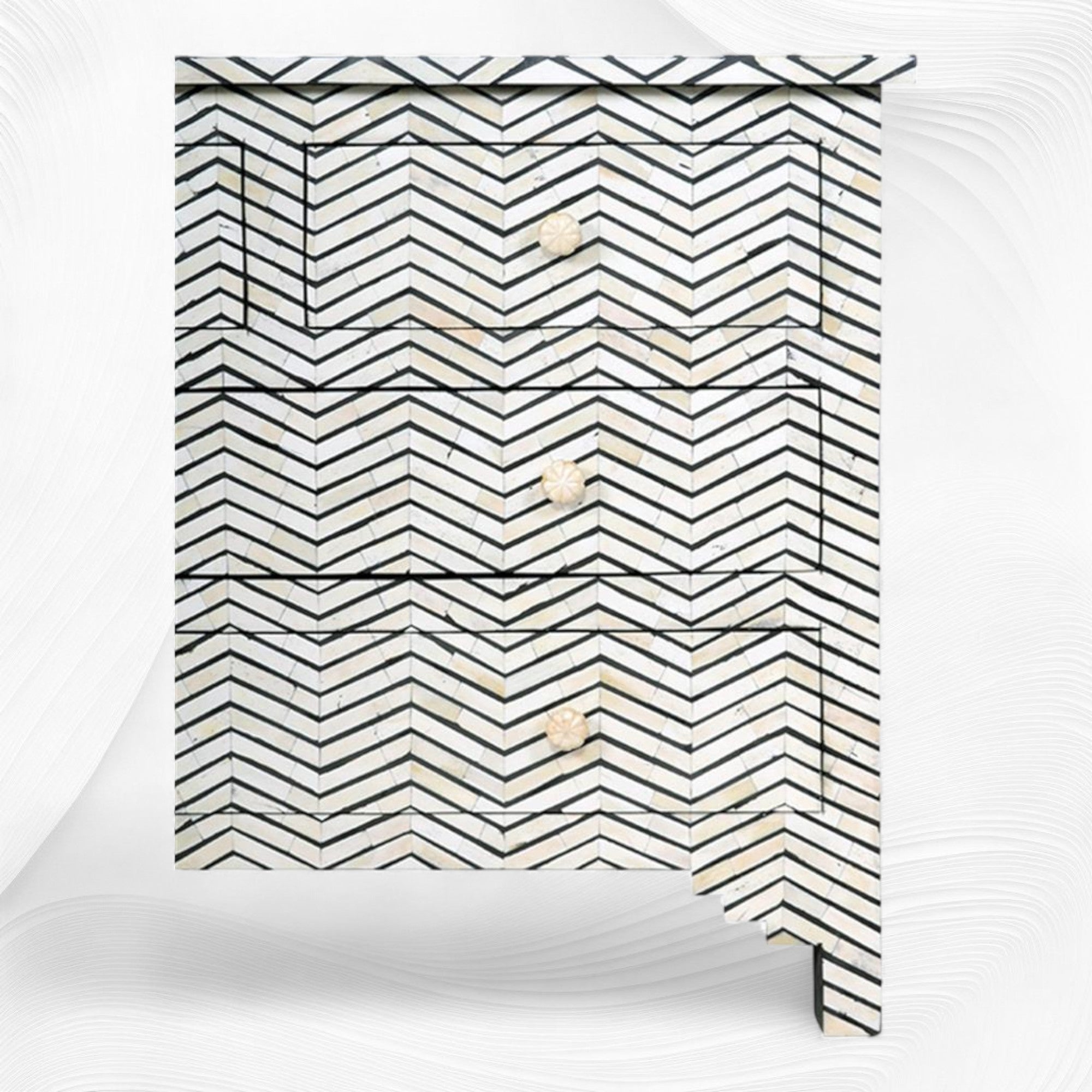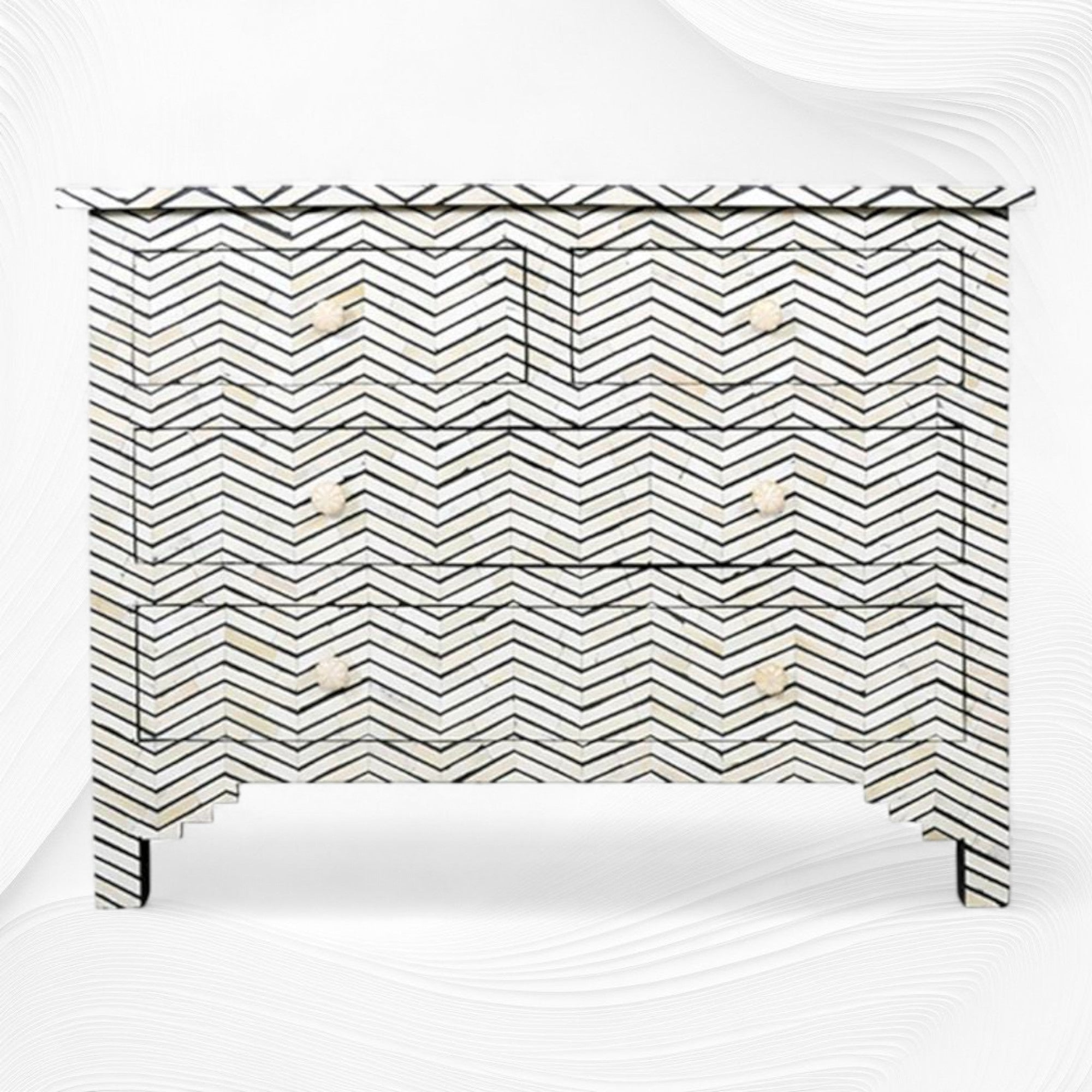 Beautiful design compliments bountiful storage with our bone inlay commode. Four drawer design crafted with bone and resin in a classic chevron pattern, exclusive to Luxury Handicrafts.
