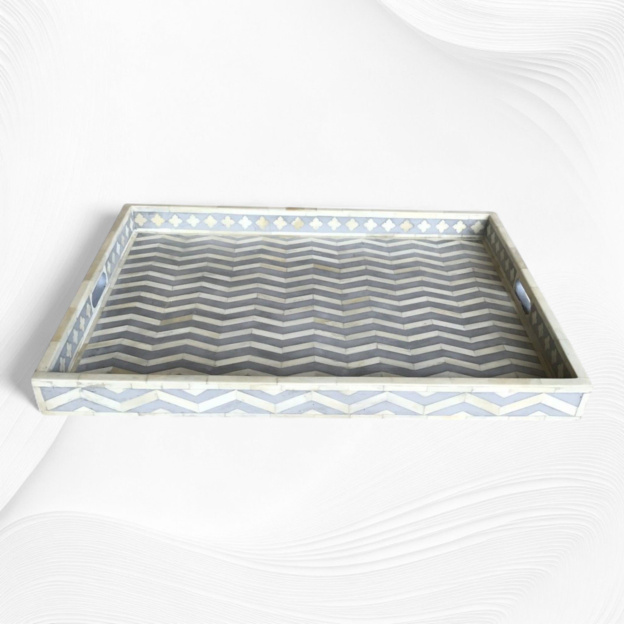 Supremely bold, this fabulous decorative tray is our new favorite thing. Featuring bone-inlay and grey hue, this ottoman tray is right at home on a countertop, vanity, coffee table or cheeky beverage cart.