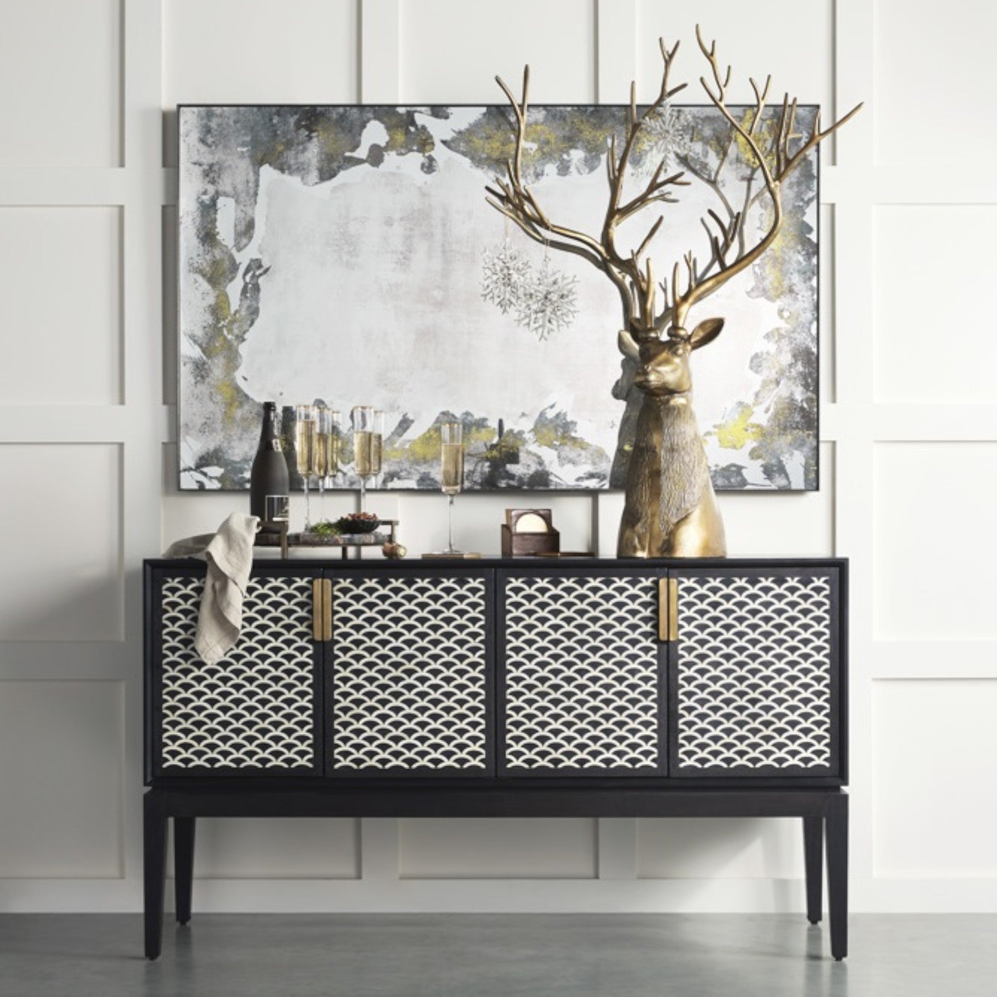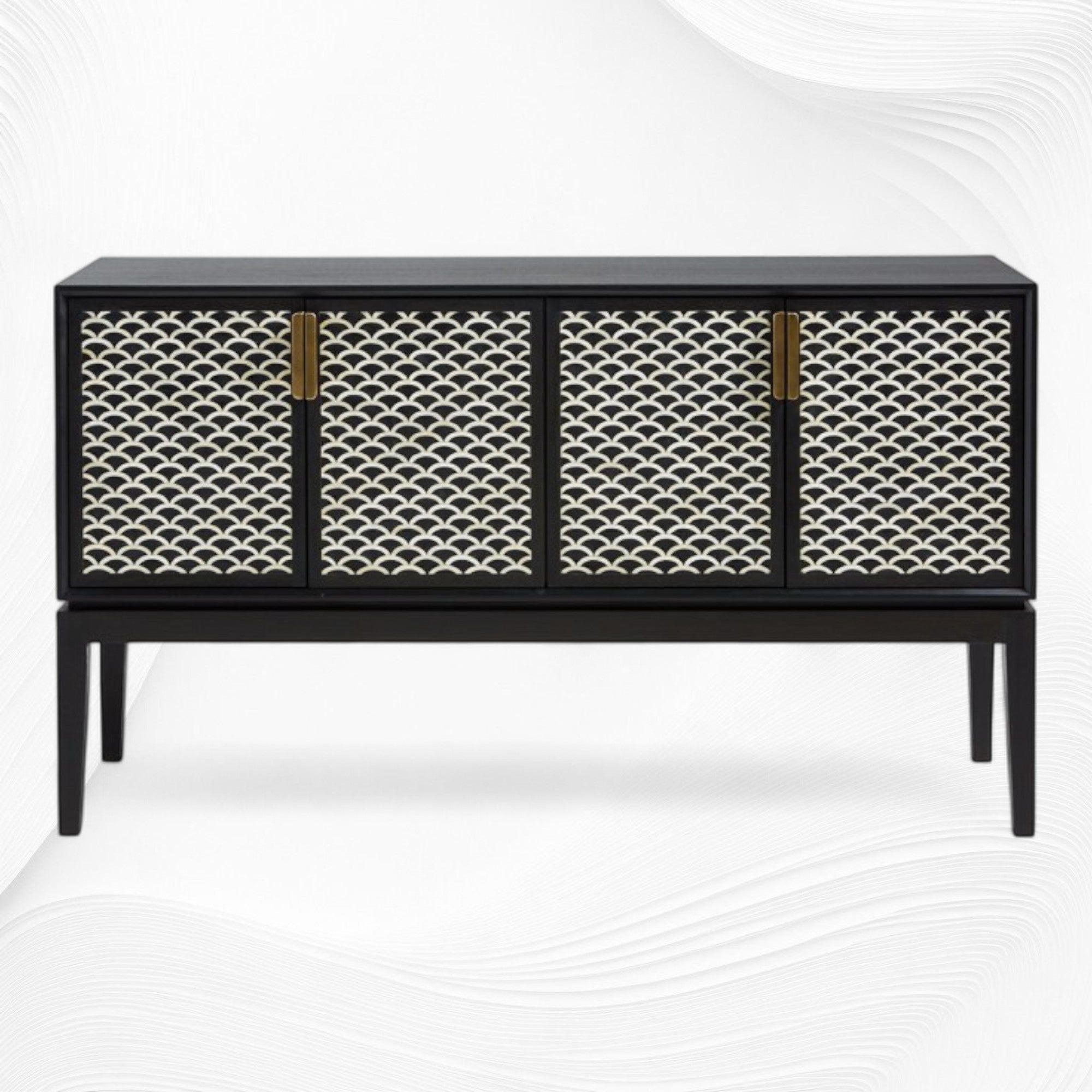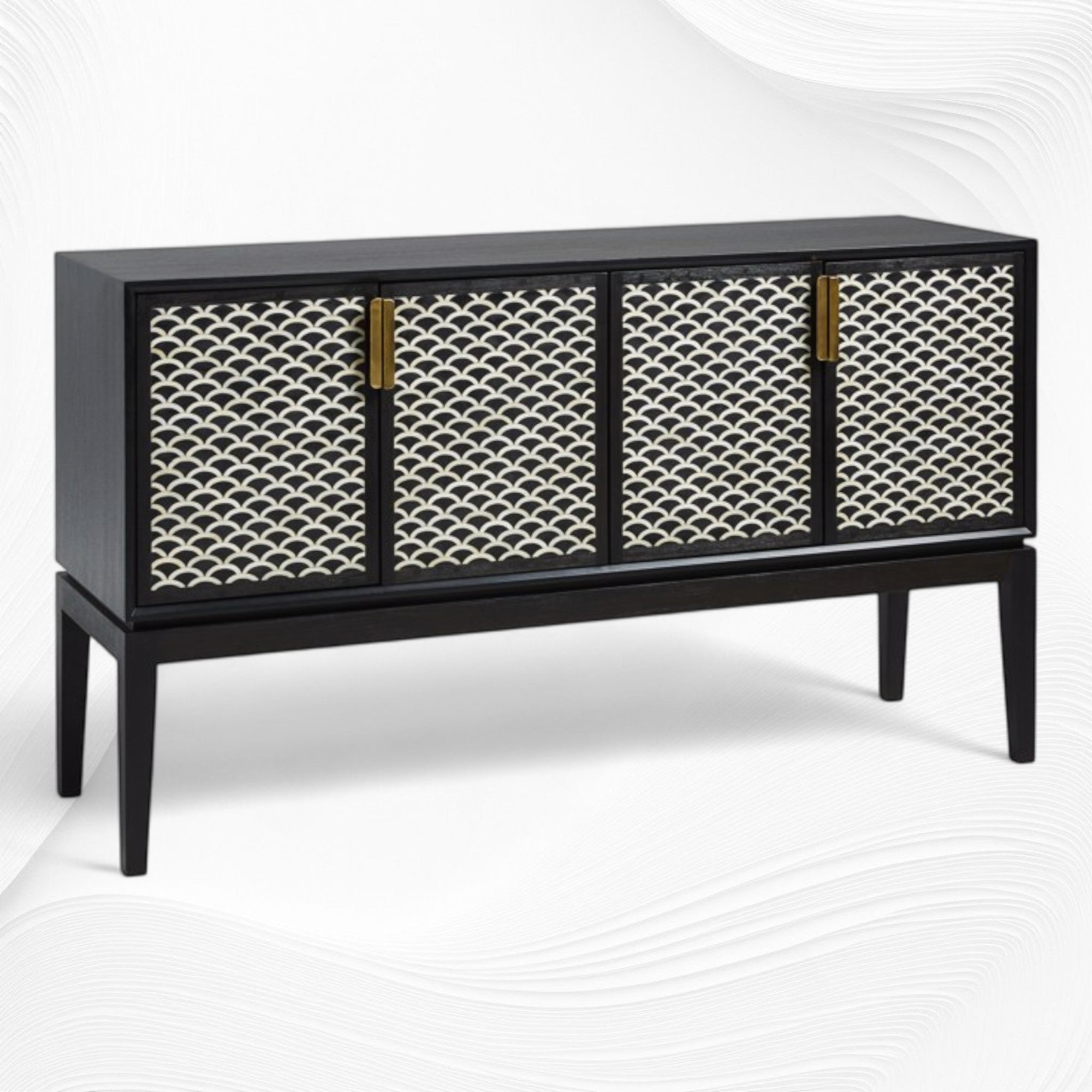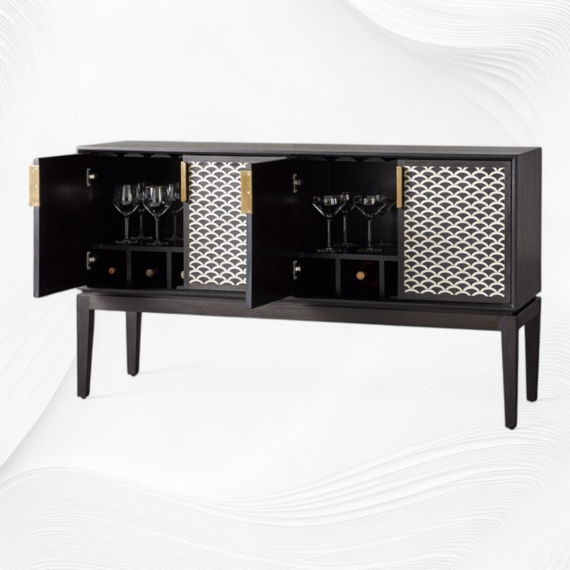 Traditional artistry for modern gathering - Painstakingly handcrafted by Indian artisans, our designer Bar Cabinets are elegantly adorned with a stunning fish scale motif formed from hand-finished bone inlay. Cabinet interiors include ample storage for beverages and barware, featuring a 10-bottle wine rack and stemware storage for 12 wine glasses.