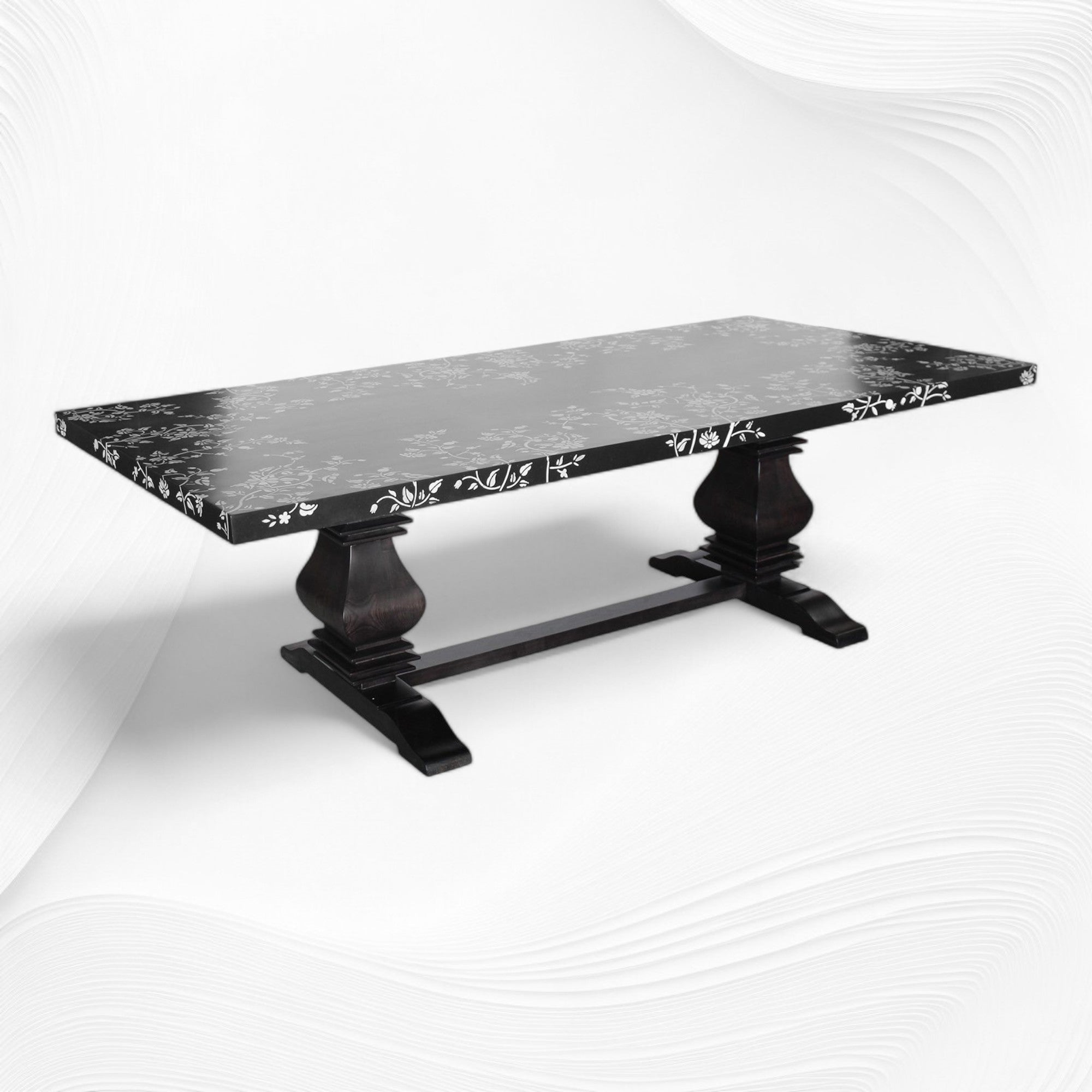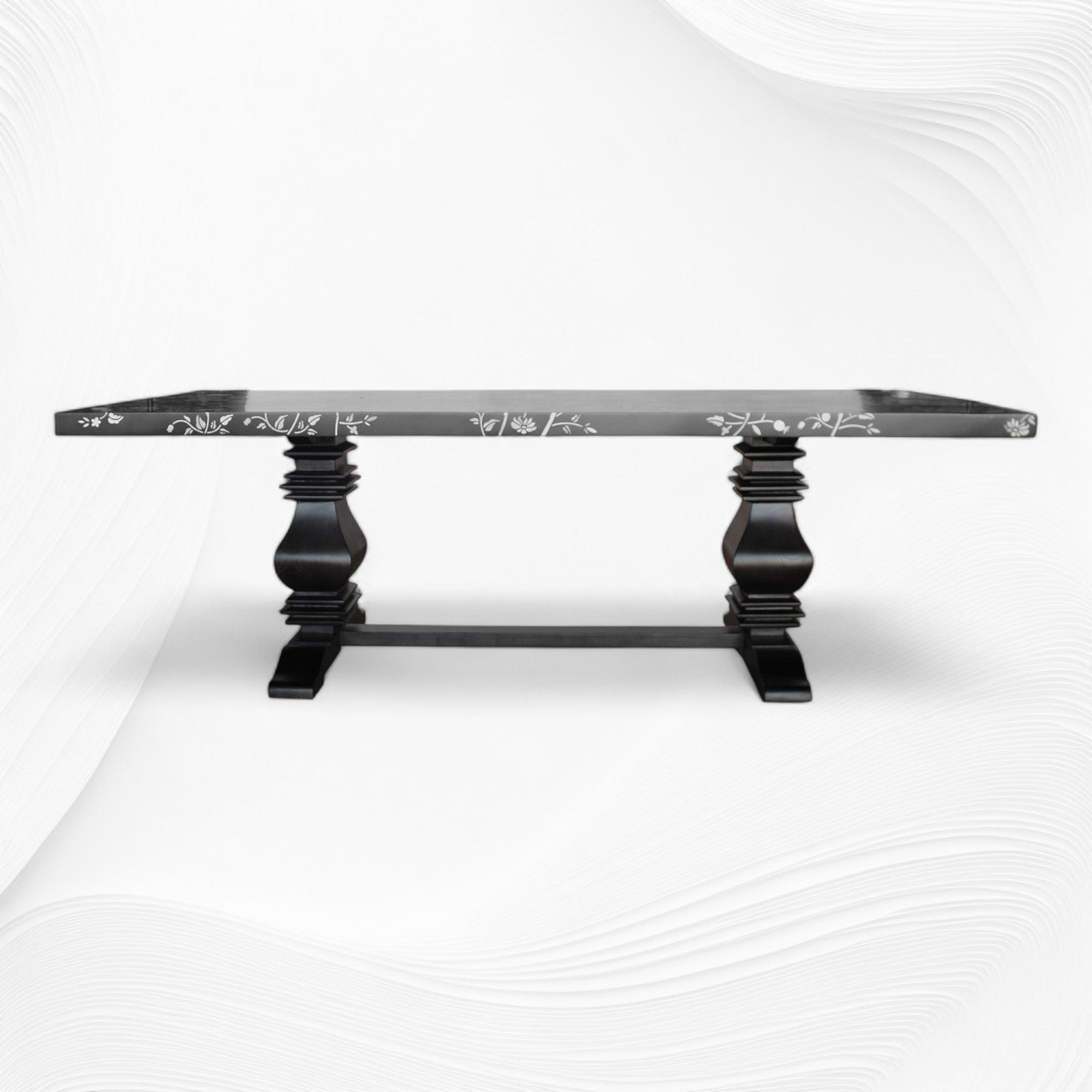 Create a dining space that you and your guests will adore with the stunning Bone inlay dining table. The table features a patterned bone inlay top that resembles ivory fauna stretching across a black backdrop. This Dining Table ensures your dining area makes a true impression.