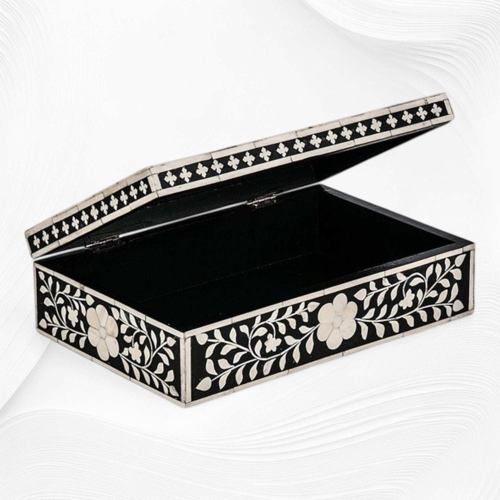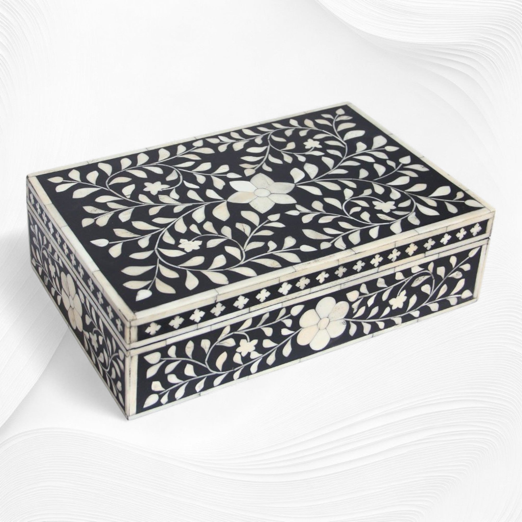 Bone Inlay is the timeless jewel in Indian Inlay Furniture. Luxurious and elegant, these Floral Boxes are the perfect pieces to add that exotic spirit into your bedroom. This Box has an intricate floral detail as well as gorgeous carved bone handles. Each box has been laboriously handcrafted in India by skilled artisans.