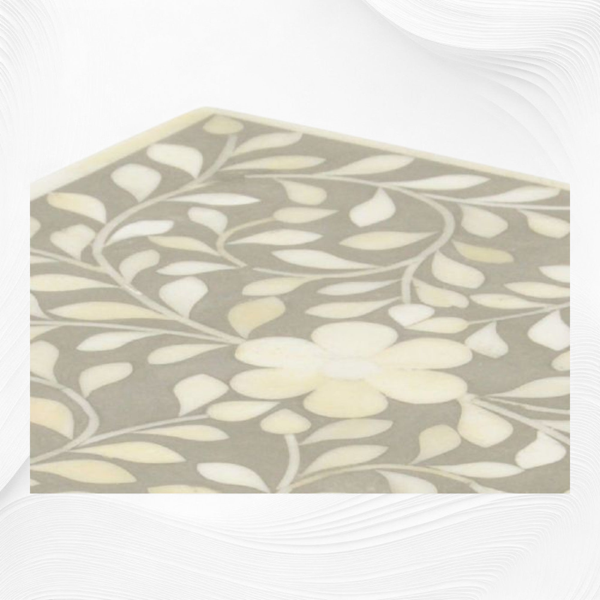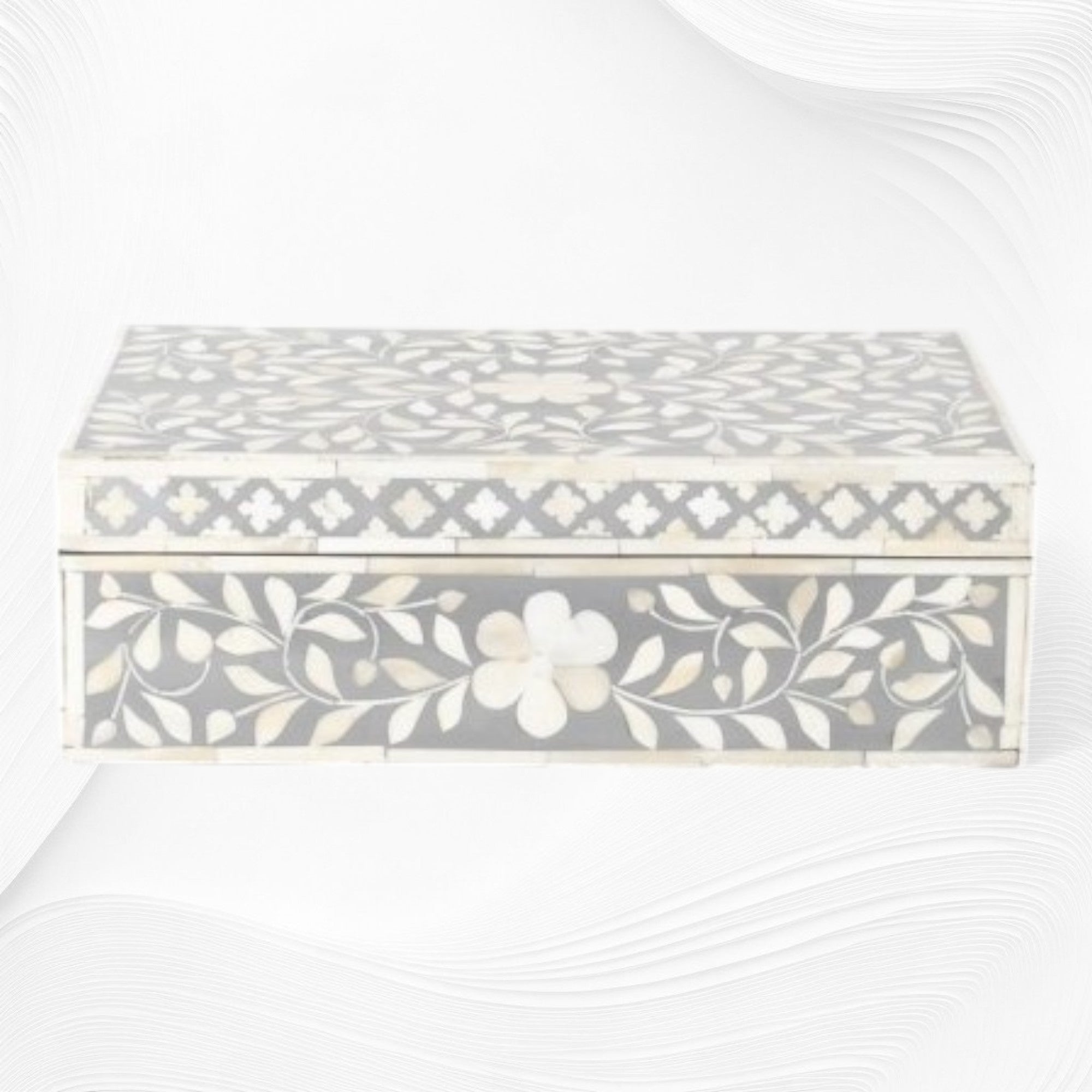 Bone Inlay is the timeless jewel in Indian Inlay Furniture. Luxurious and elegant, these Floral Boxes are the perfect pieces to add that exotic spirit into your bedroom. This Box has an intricate floral detail as well as gorgeous carved bone handles.