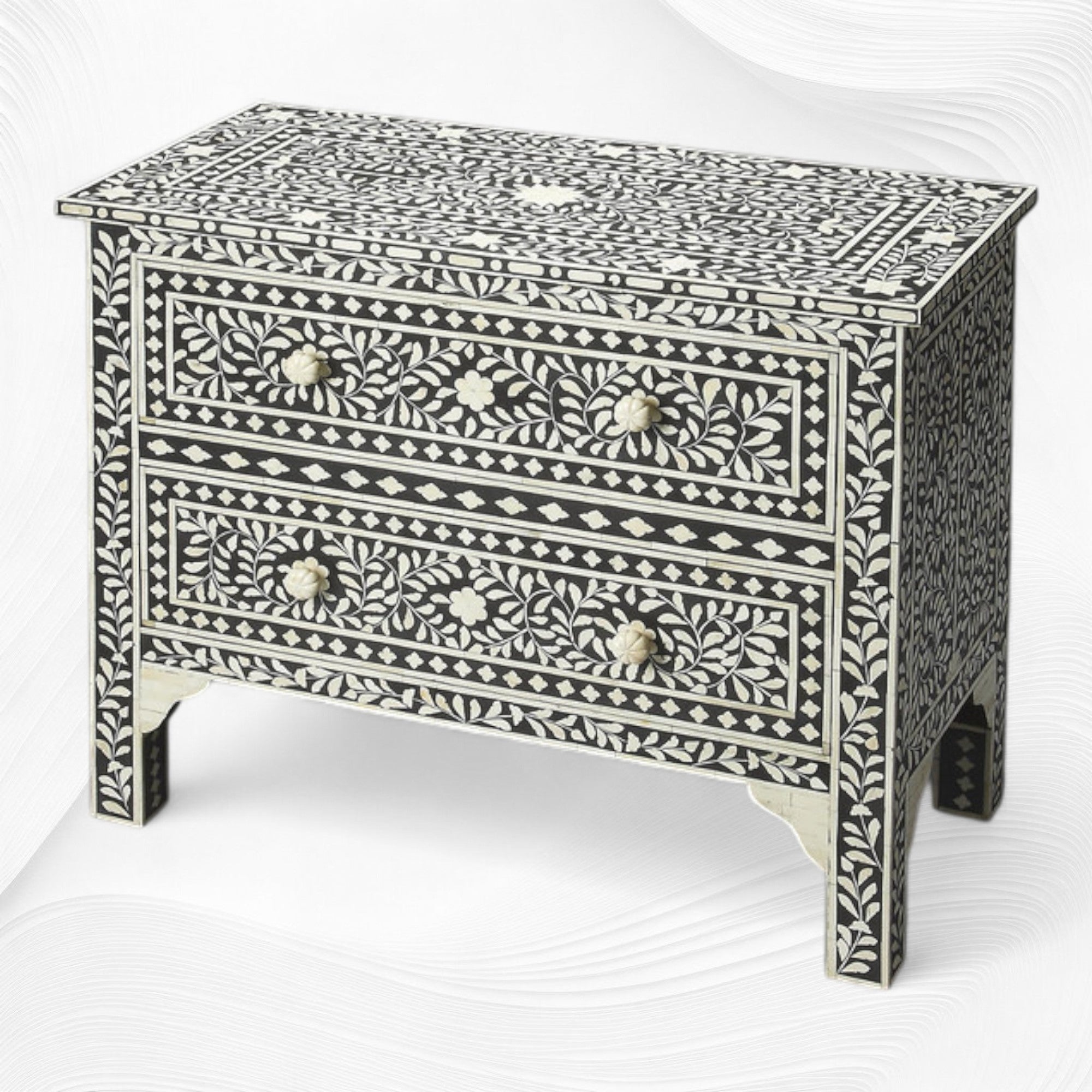 Luxurious and elegant, this Chest of Drawer is the perfect piece of bedroom / living room furniture to add that exotic spirit into your house. This range of chest of drawers have intricate floral detail as well as gorgeous carved bone handles. These chests are a great large size, with room for a lamps, plus all of your essentials on top. With two large drawers shape, this beautiful chest are an elegant timeless piece of home furniture.