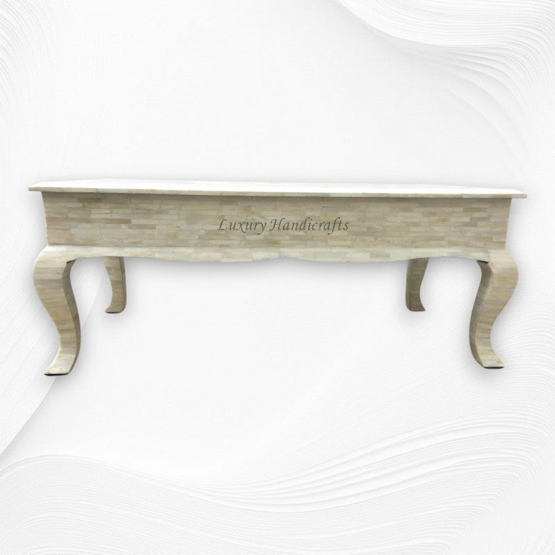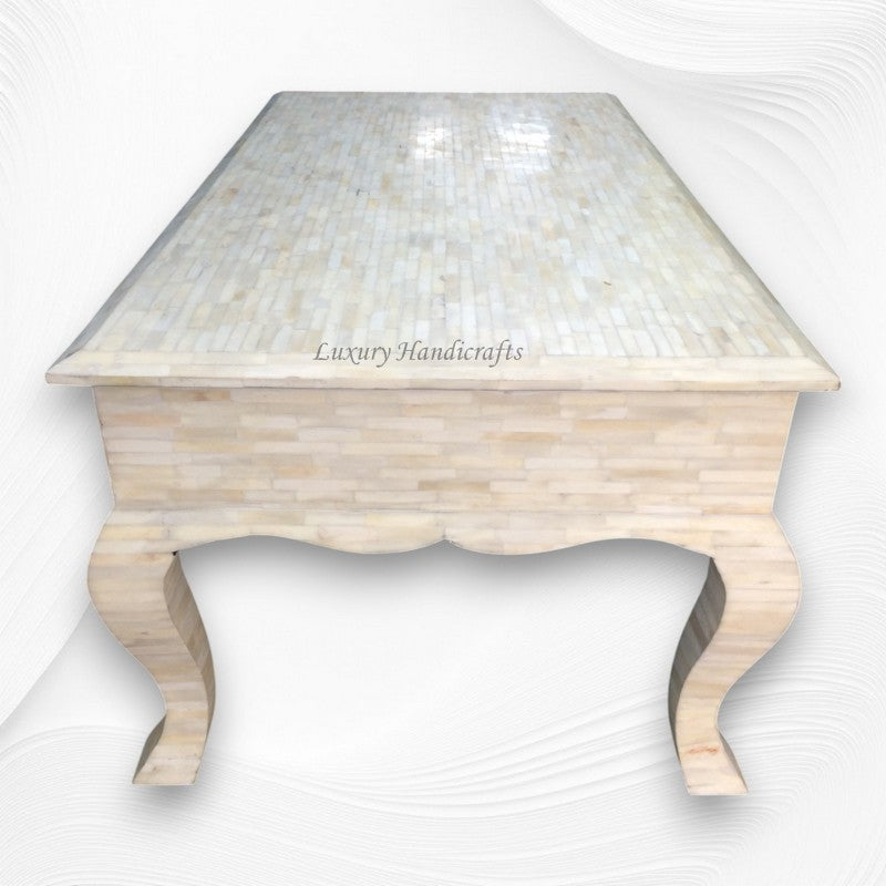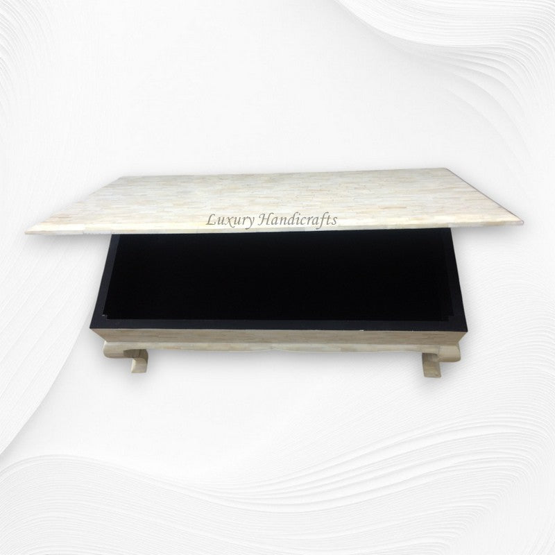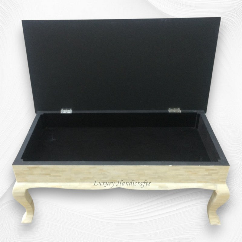 An artful design to make this piece of furniture as center of attraction of your home. This complete camel bone inlay piece is newest addition to Luxury Handicrafts collection. Not just a center table, this versatile piece doubles as a trunk box, providing ample storage space for your belongings while serving as a focal point in your living space. Its elegant design and premium materials make it a standout addition to both contemporary and classic interiors.