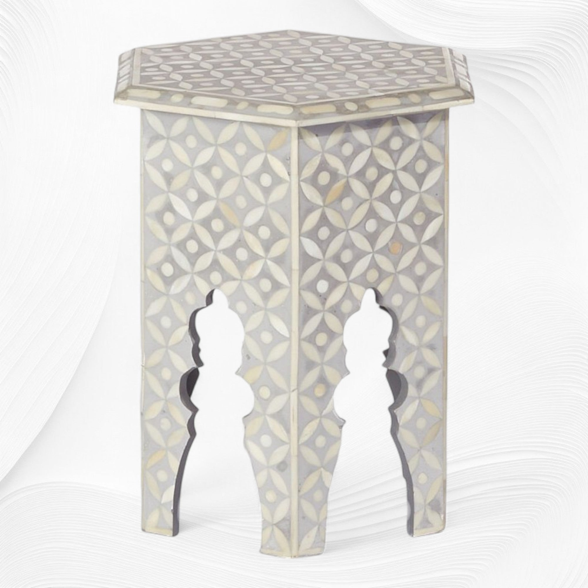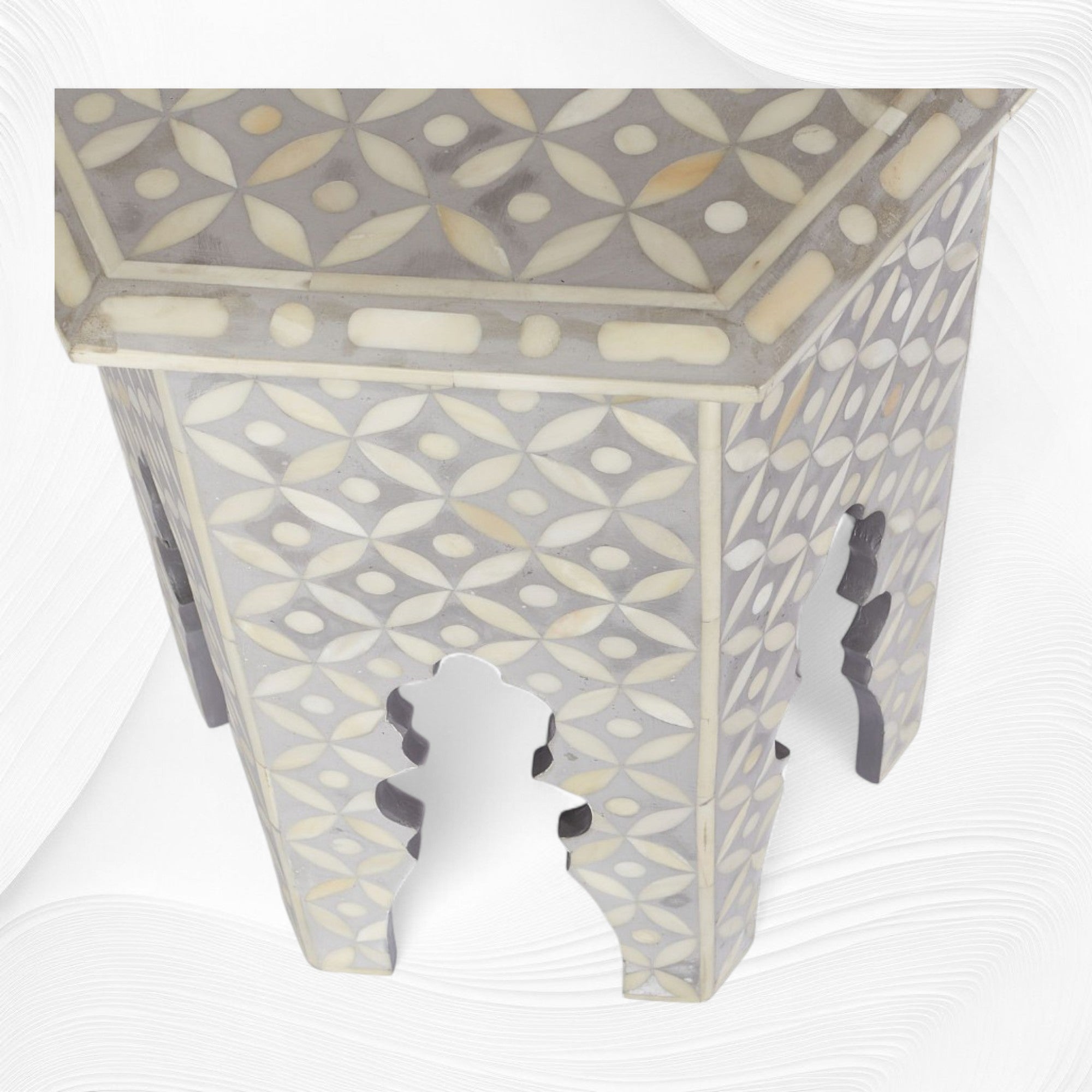 This petite bone inlay side table in Hexagonal structure and geometrical bone inlaid design would make a perfect accent in any room.