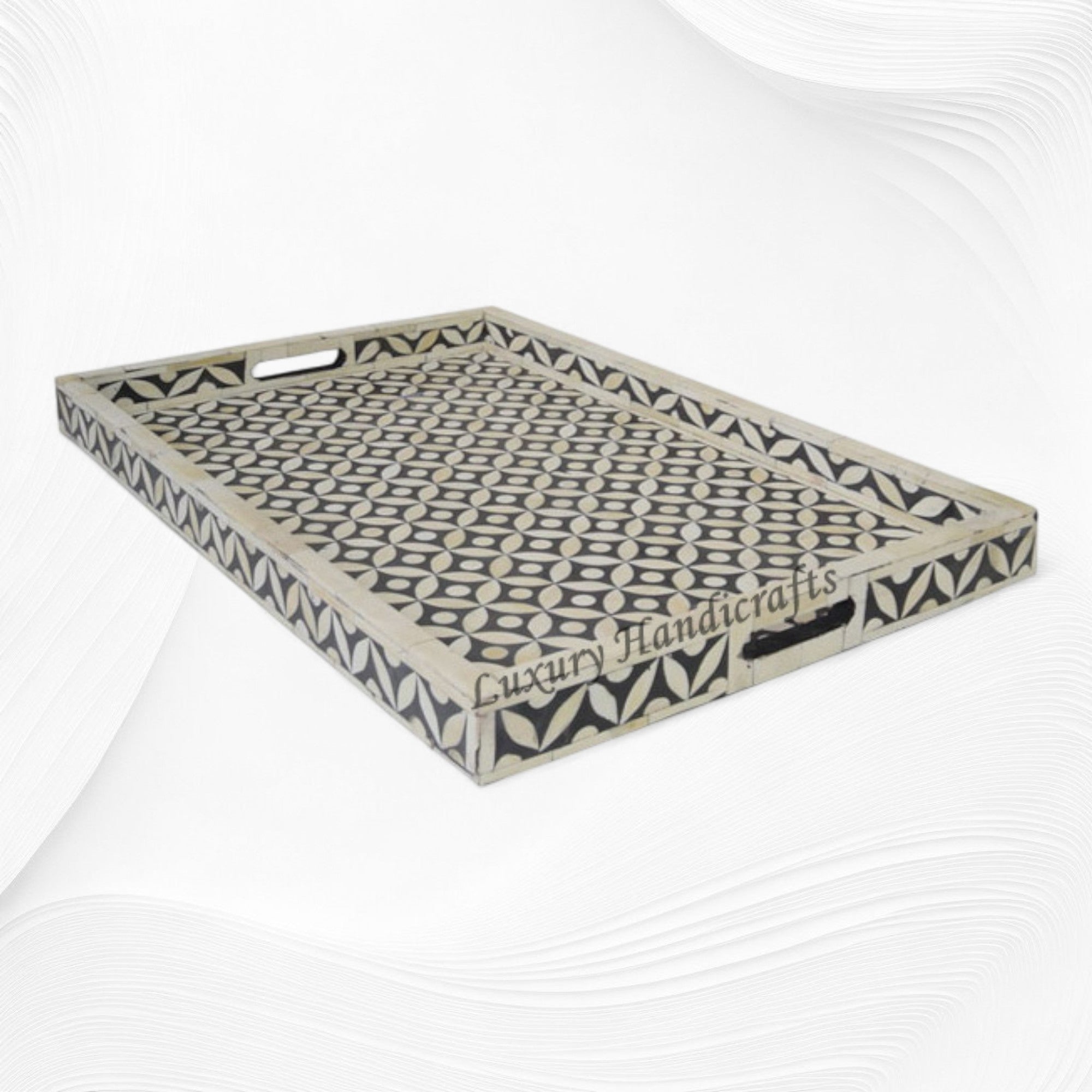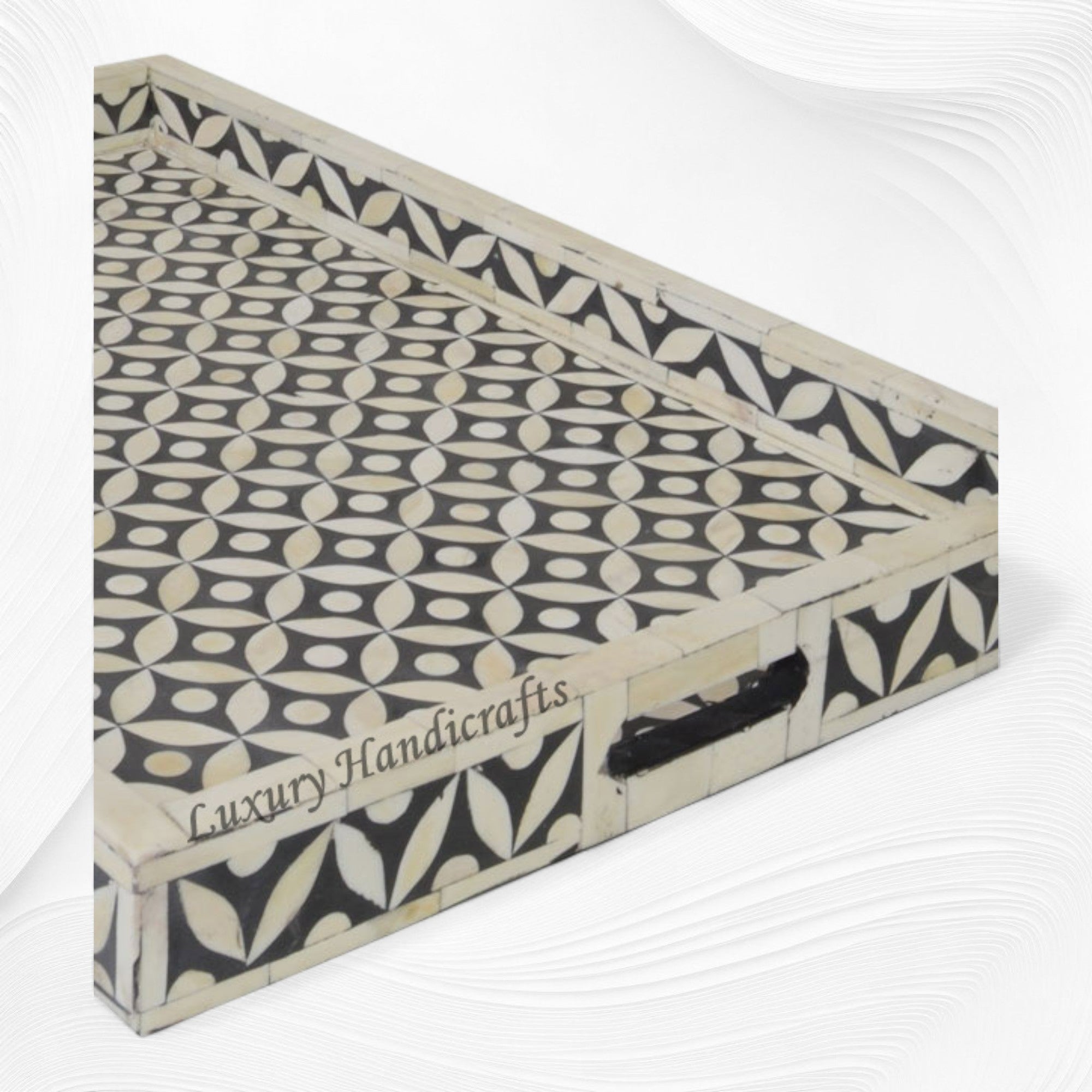 The intricate Black Bone Inlay Geometric Tray, this gorgeous tray was achieved by individually carving pieces and affixing them into a colorful Resin structured in a solid wooden frame.