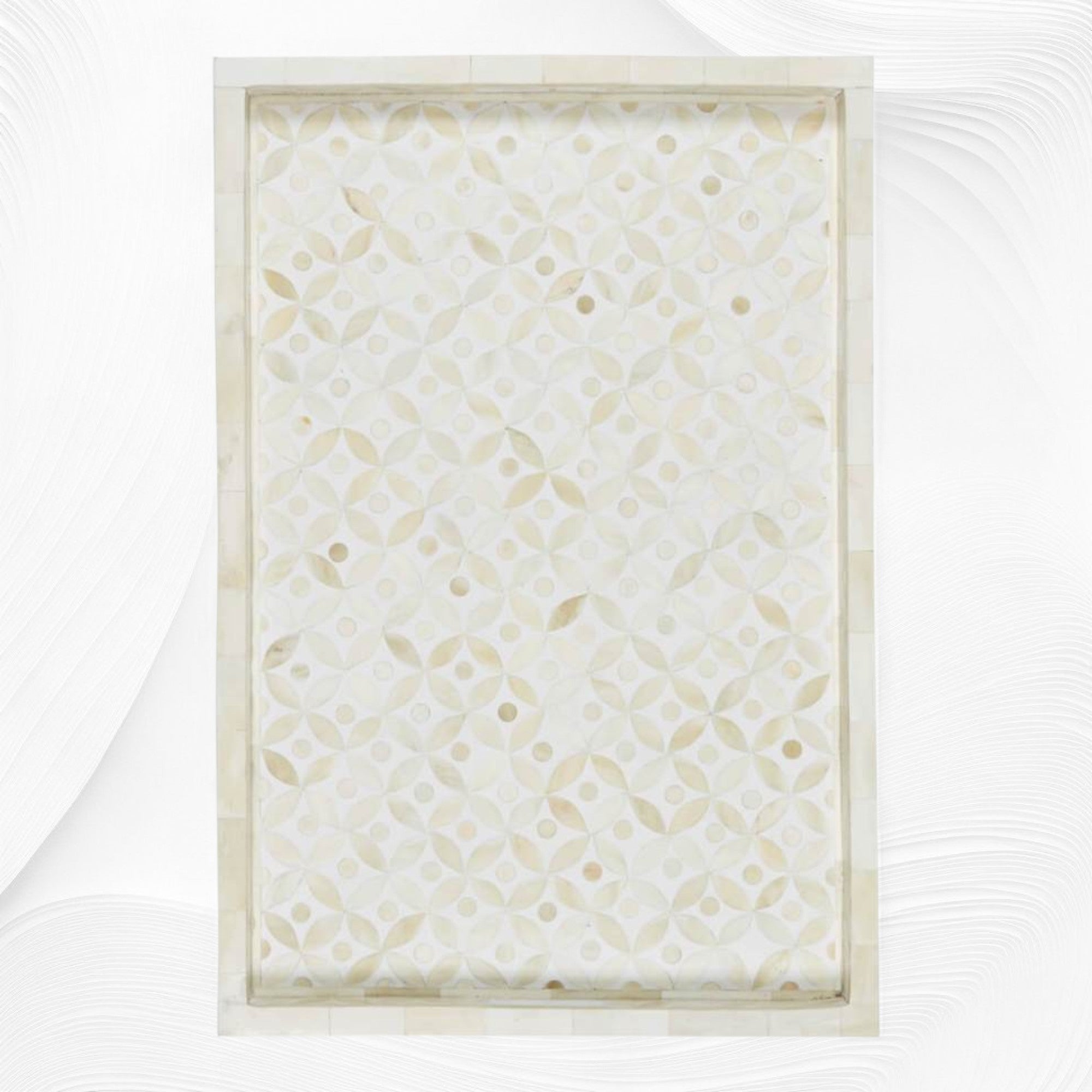 The intricate bone geometric pattern of this gorgeous tray was achieved by individually carving pieces and affixing them into a colourful Resin structured in solid wooden frame.