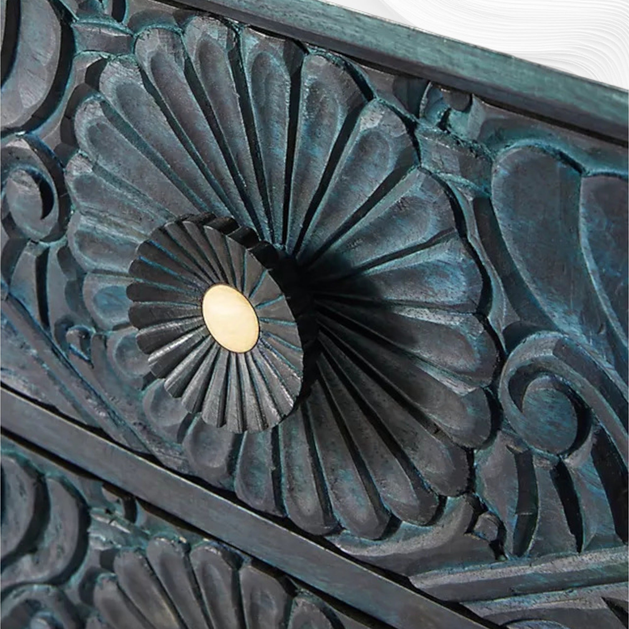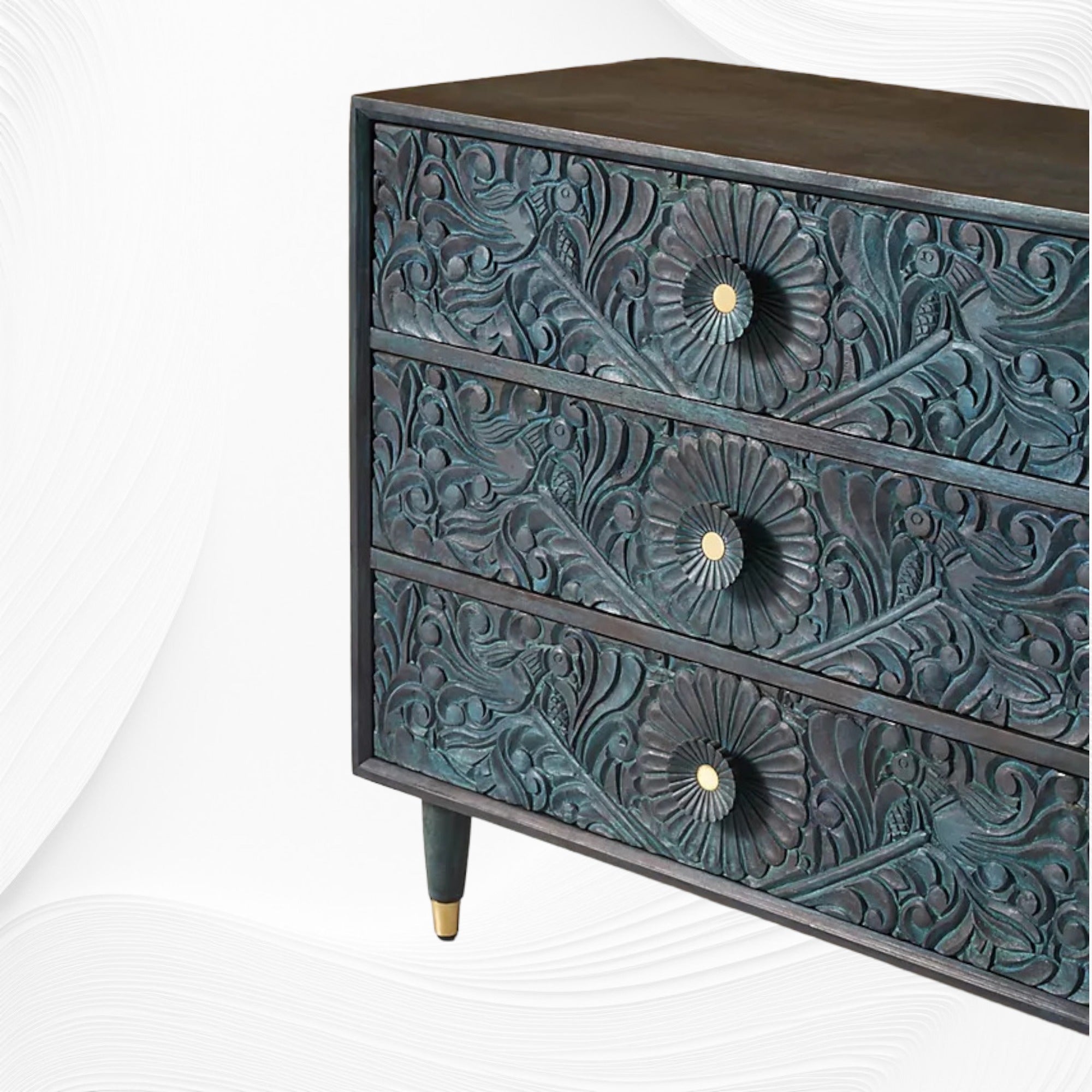 The warmth of this solid tropical hardwood, six-drawer dresser invites a classic, bohemian-inflected aesthetic into your space. Meticulously carved in an appealing, all-over floral motif, it's finished with brass-capped hardware and legs to complete its cool yet refined look.