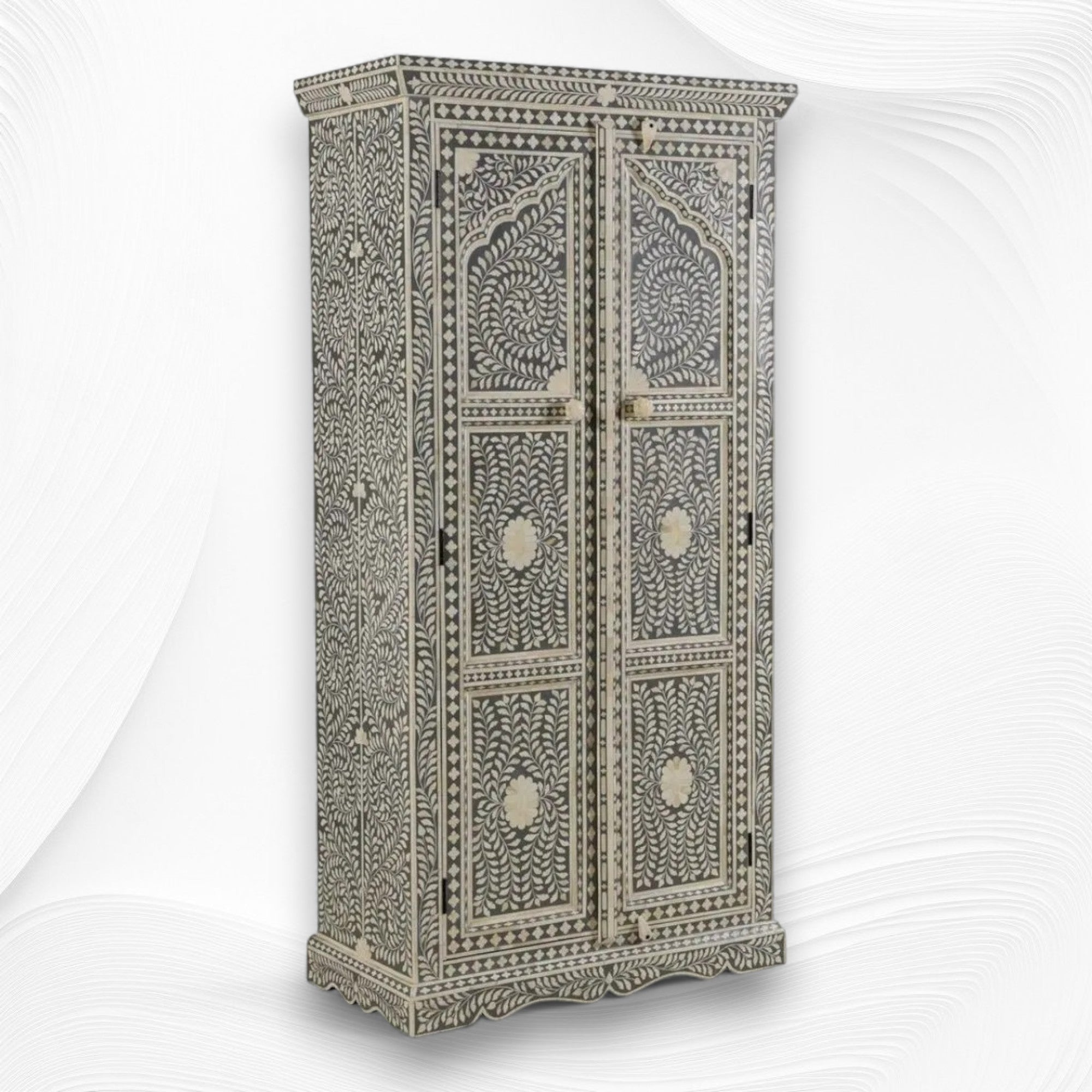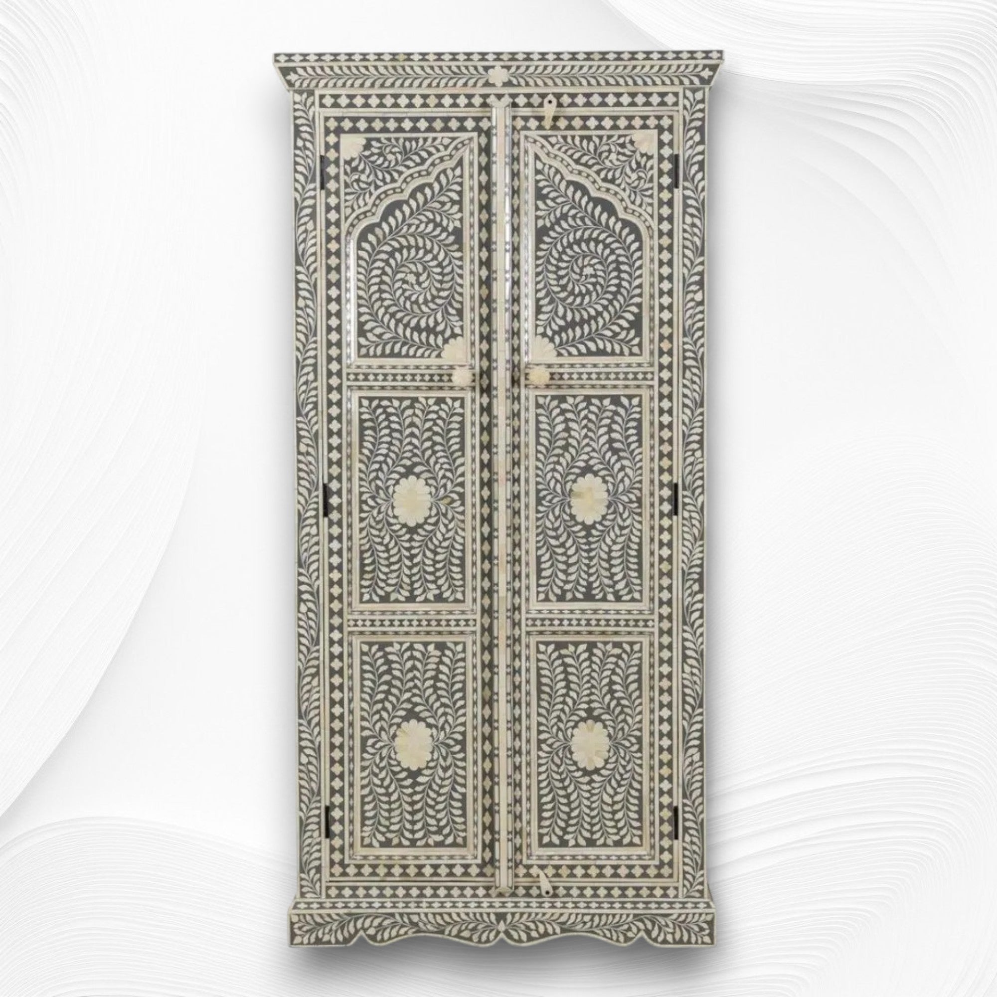 Introducing our beautiful Jharokha Design Bone Inlay Floral Almirah in classy grey colors. This handmade treasure blends old-fashioned skill with modern style, making it a stunning addition to your home.