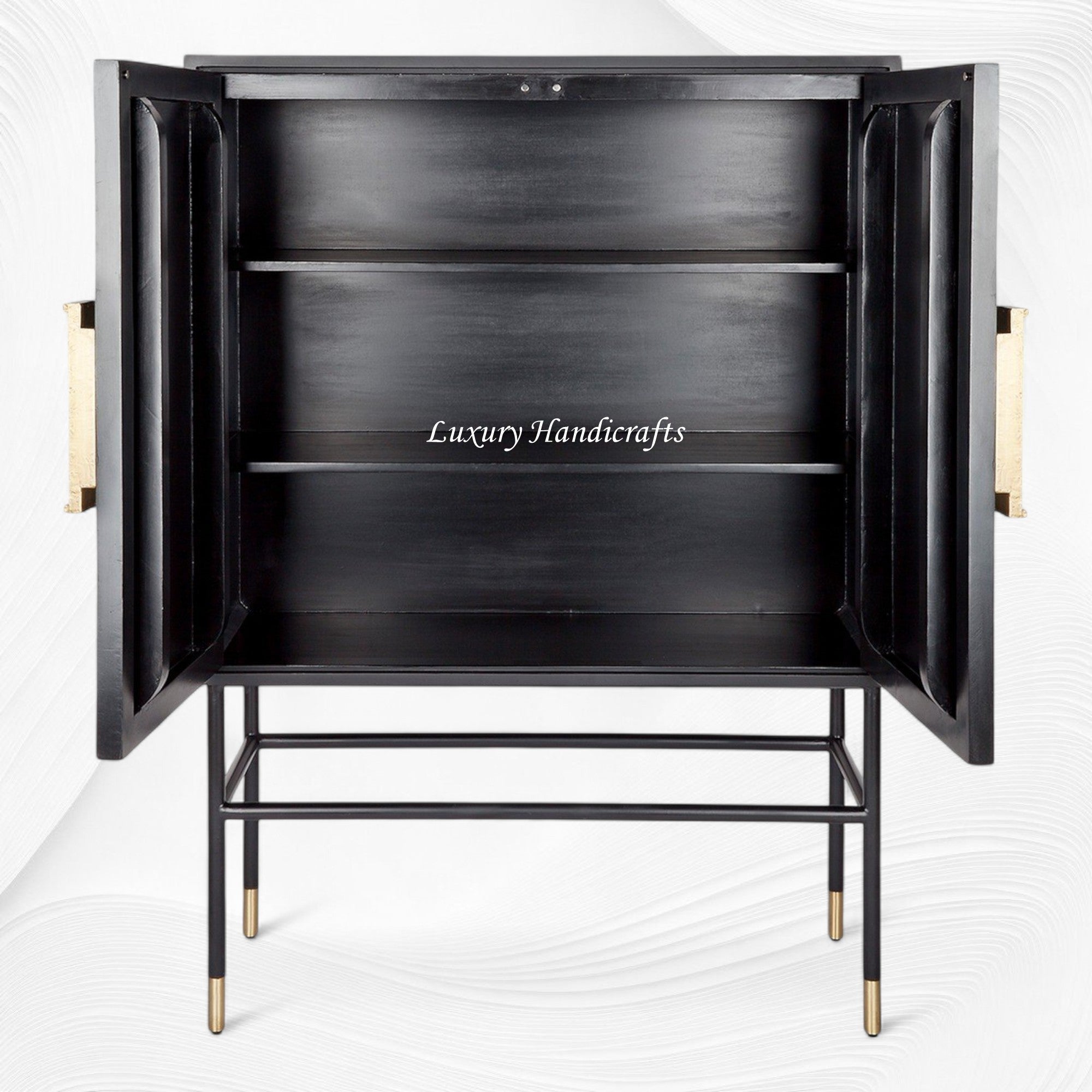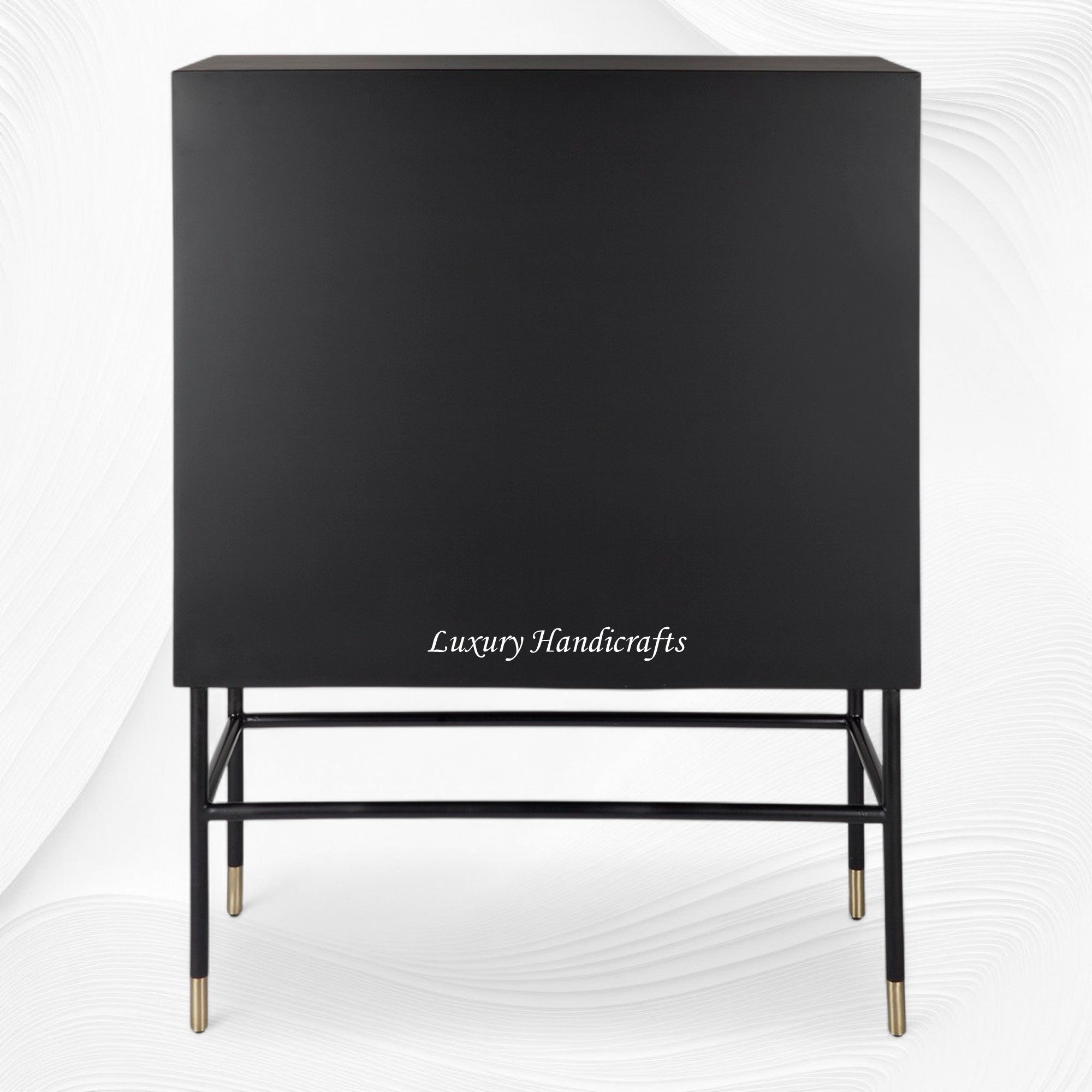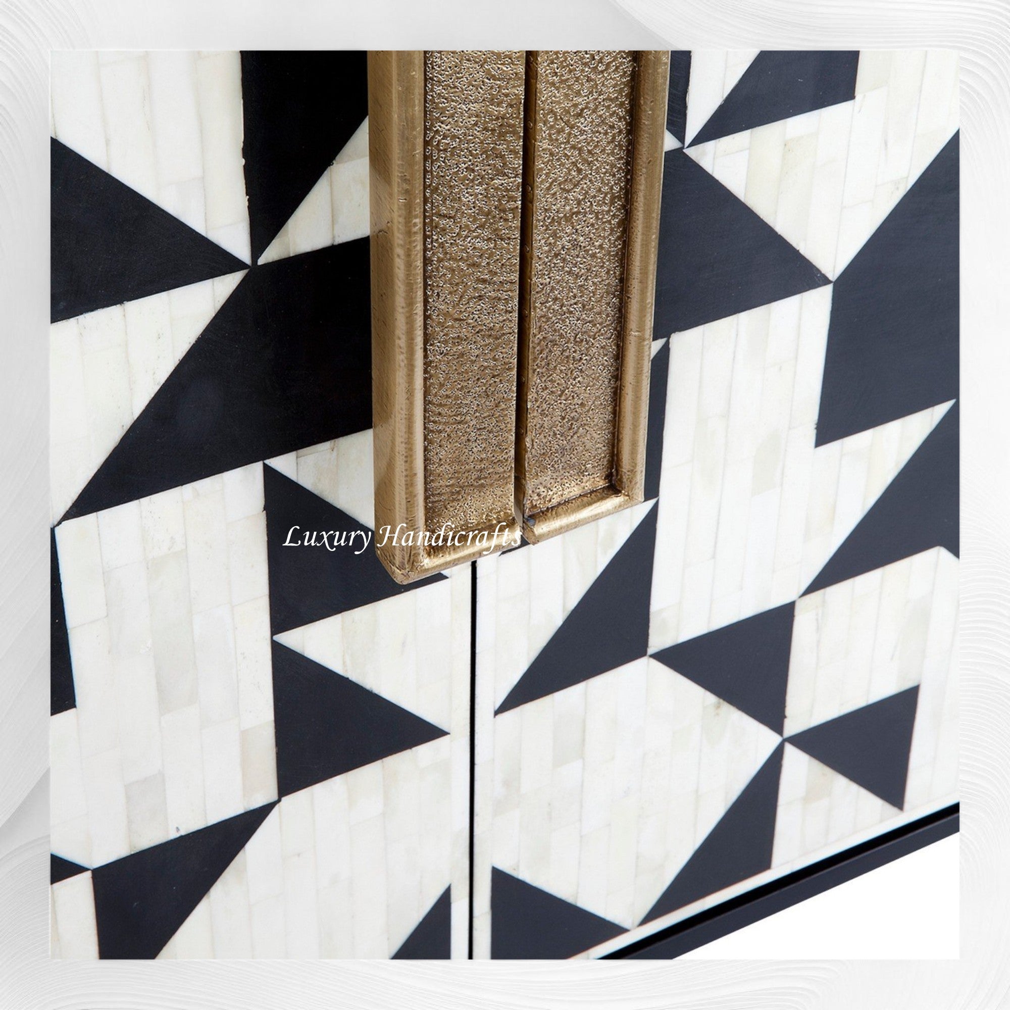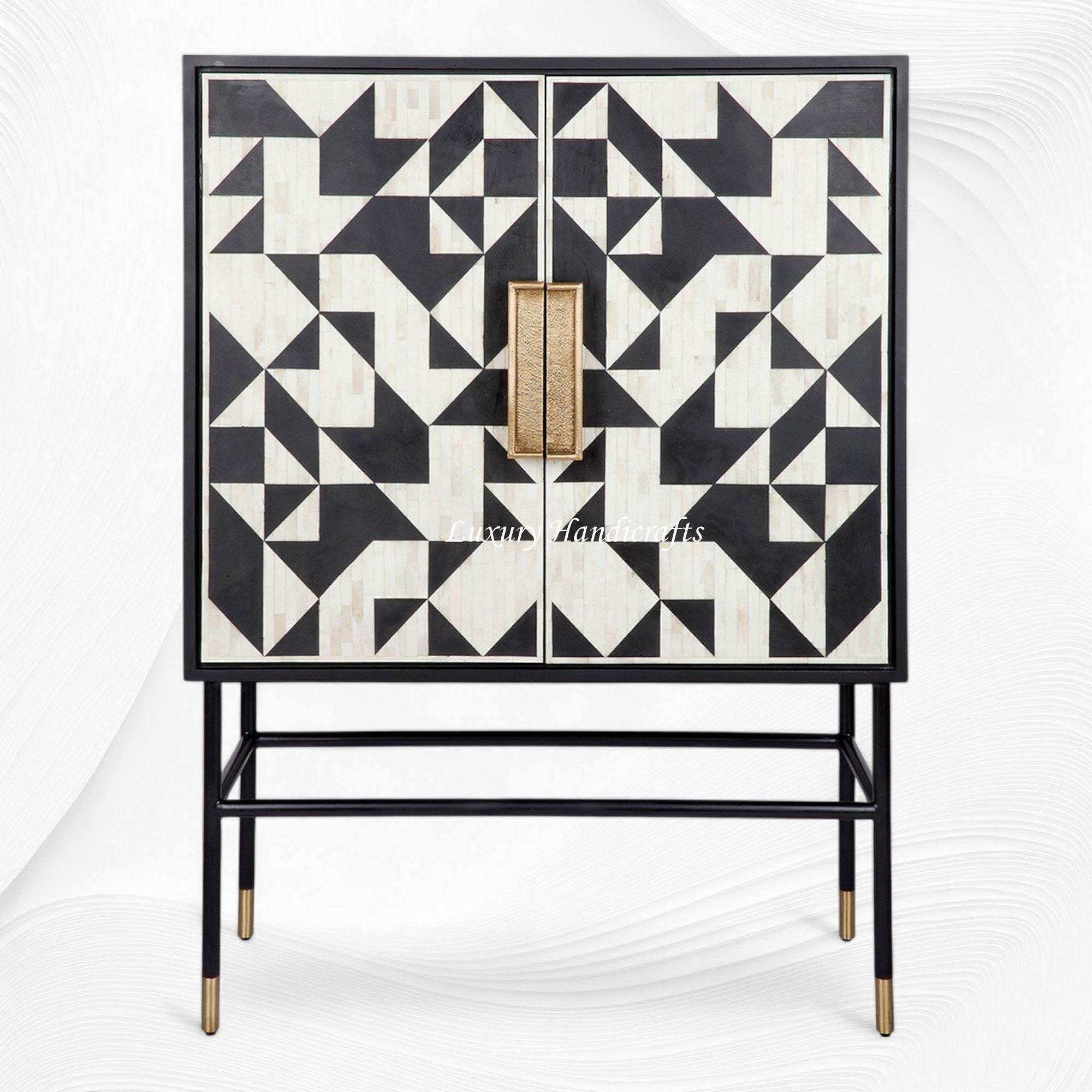 The Junto cabinet is a captivating statement of modern elegance. Its sleek black frame beautifully highlights the exquisite black and natural bone inlay design. Each tile is expertly hand-cut and carefully arranged by skilled artisans to form a detailed geometric pattern, making this piece a remarkable example of craftsmanship and style.