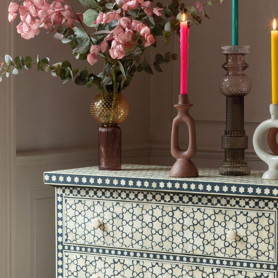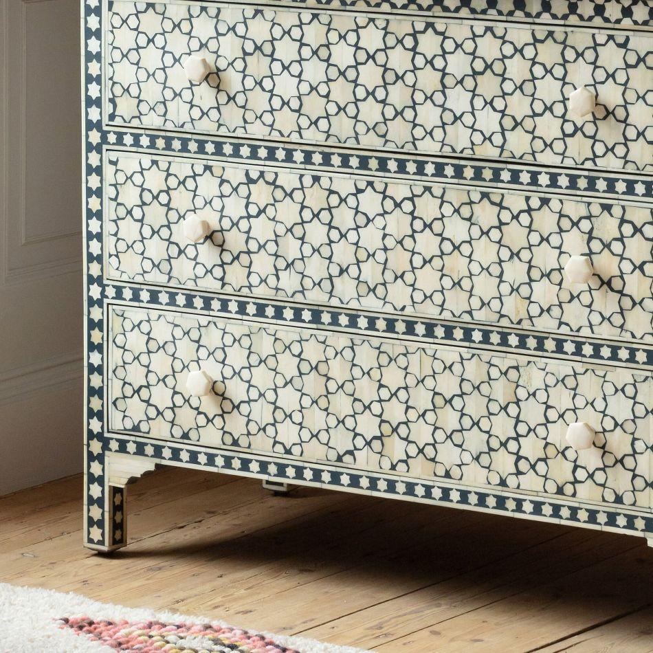 For the dreamers and the stargazers, a celestial bone inlay chest of drawers handcrafted in India by highly skilled craftsmen using traditional techniques. Each delicate piece of bone is hand pressed into resin across a wood frame to create a beautiful and deeply unique mosaic pattern and a star studded addition to your bedroom.