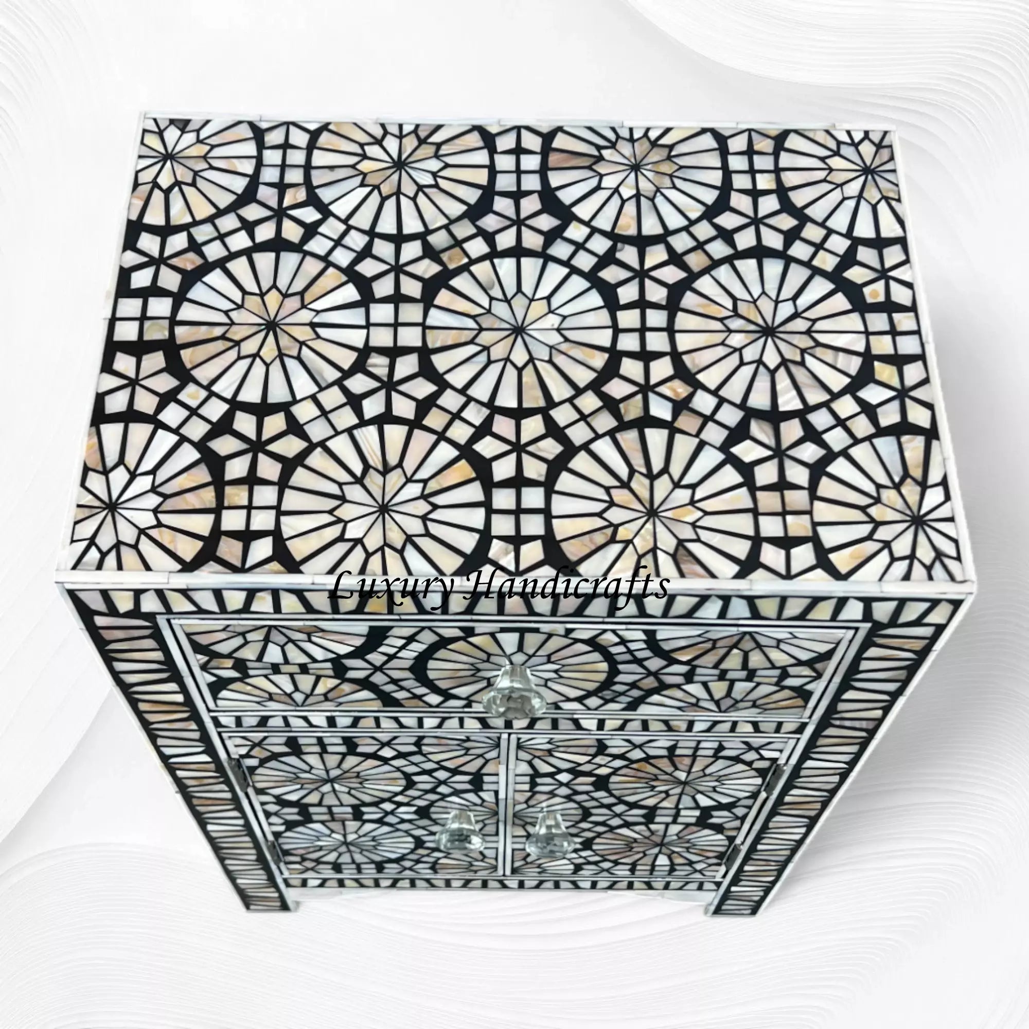 Bone inlay has a natural, earthy look with a matte finish, while Mother of Pearl inlay looks shiny and elegant with its iridescent glow. Both materials can be used for various patterns and can be applied to any furniture or homeware items in our online store.