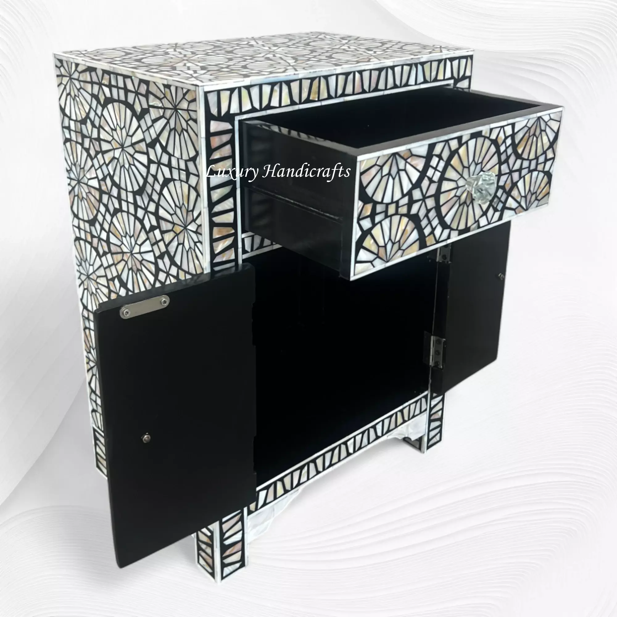 Infinitely intricate, our Kaleidoscope collection is made from hundreds of tiny pieces of bone, carved by the skilled hands of artisans in India and pressed into black resin to create swirling geometric patterns. Its single drawer and cupboard are painted black inside and finished with monochromatic striped handles.