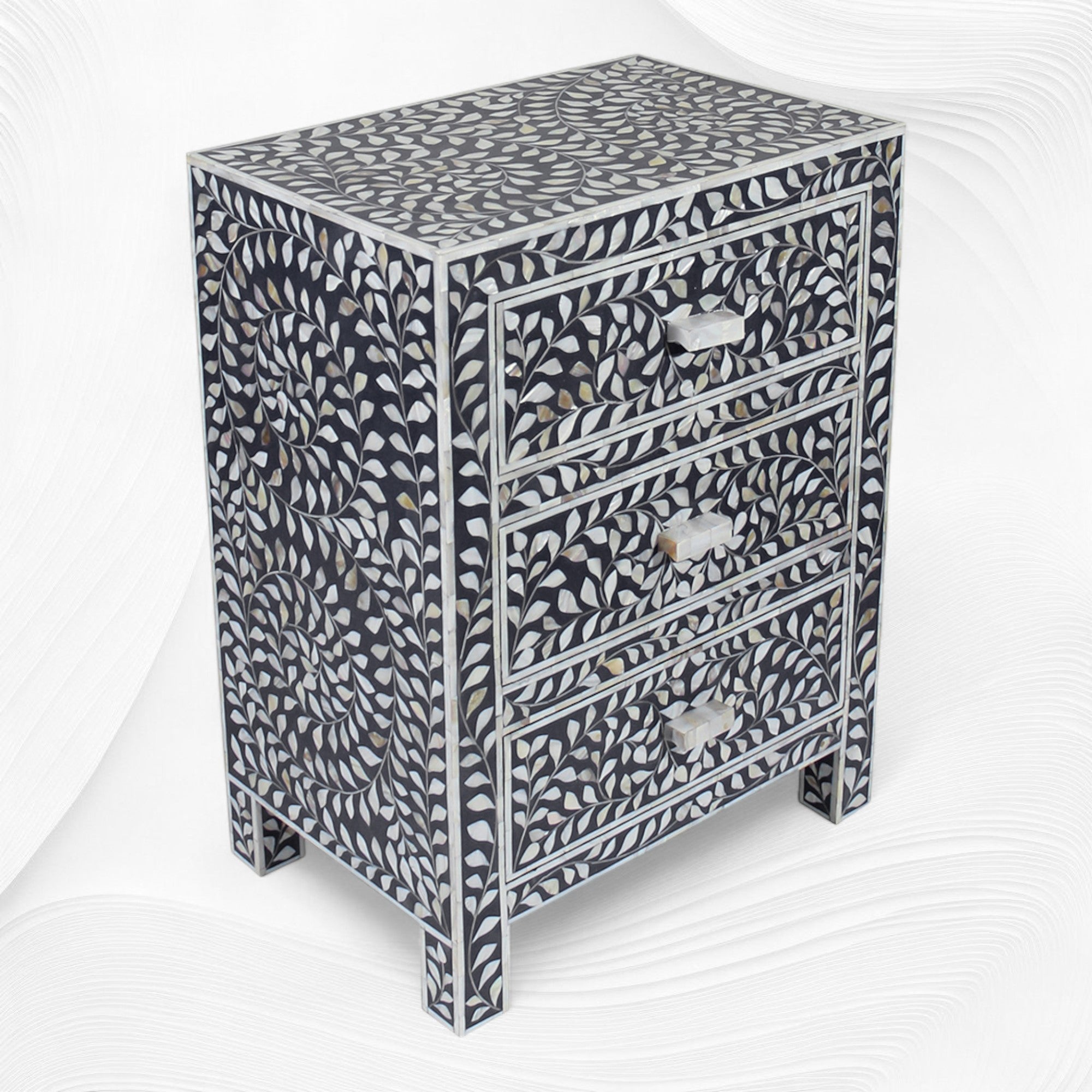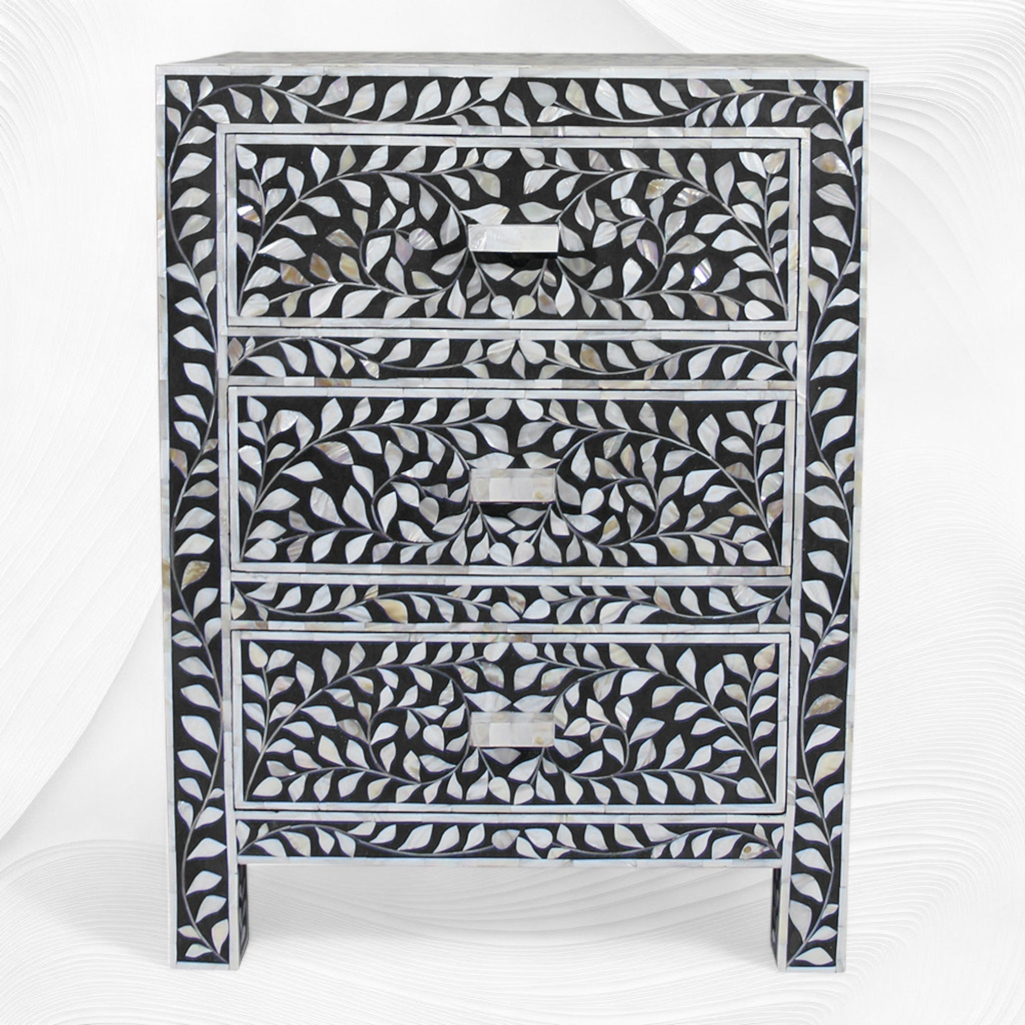 Our signature three drawer classic mother of pearl inlay table done in floral inlay. The Mother of Pearl inlay gives the same striking statement of bone inlay furniture, with the addition of the shimmer and sparkle of hundreds of Mother of Pearl pieces. Our unique mother of pearl handlebar knobs complete the look.