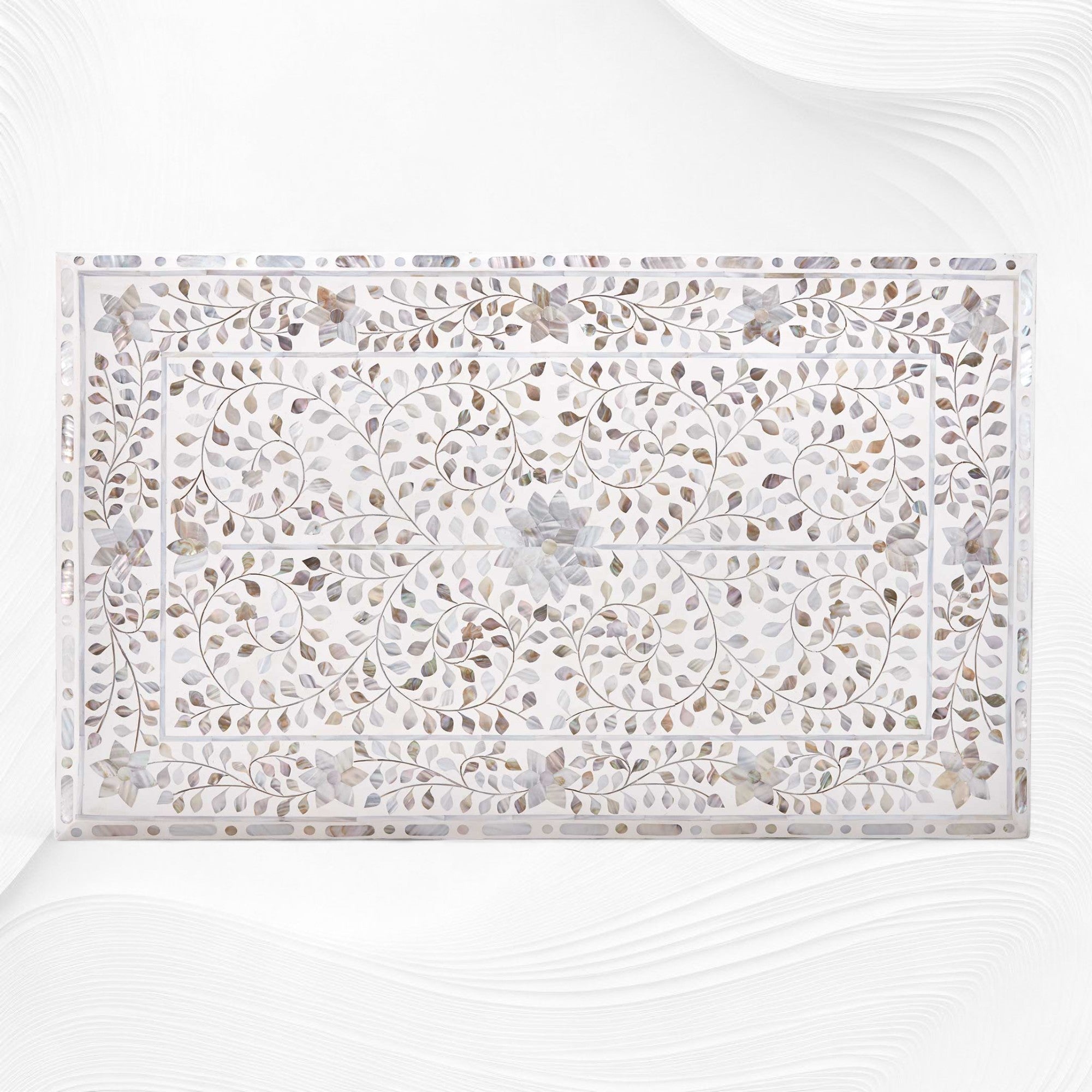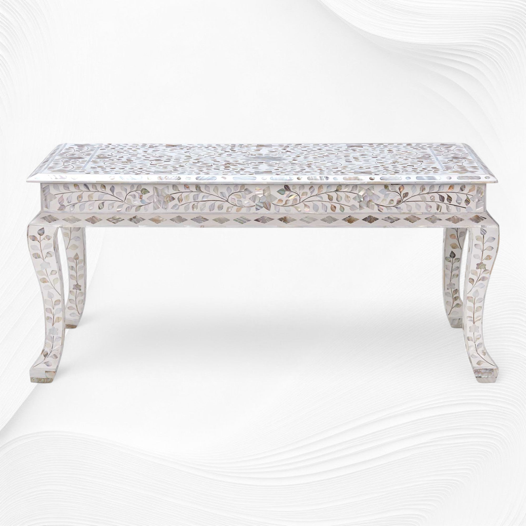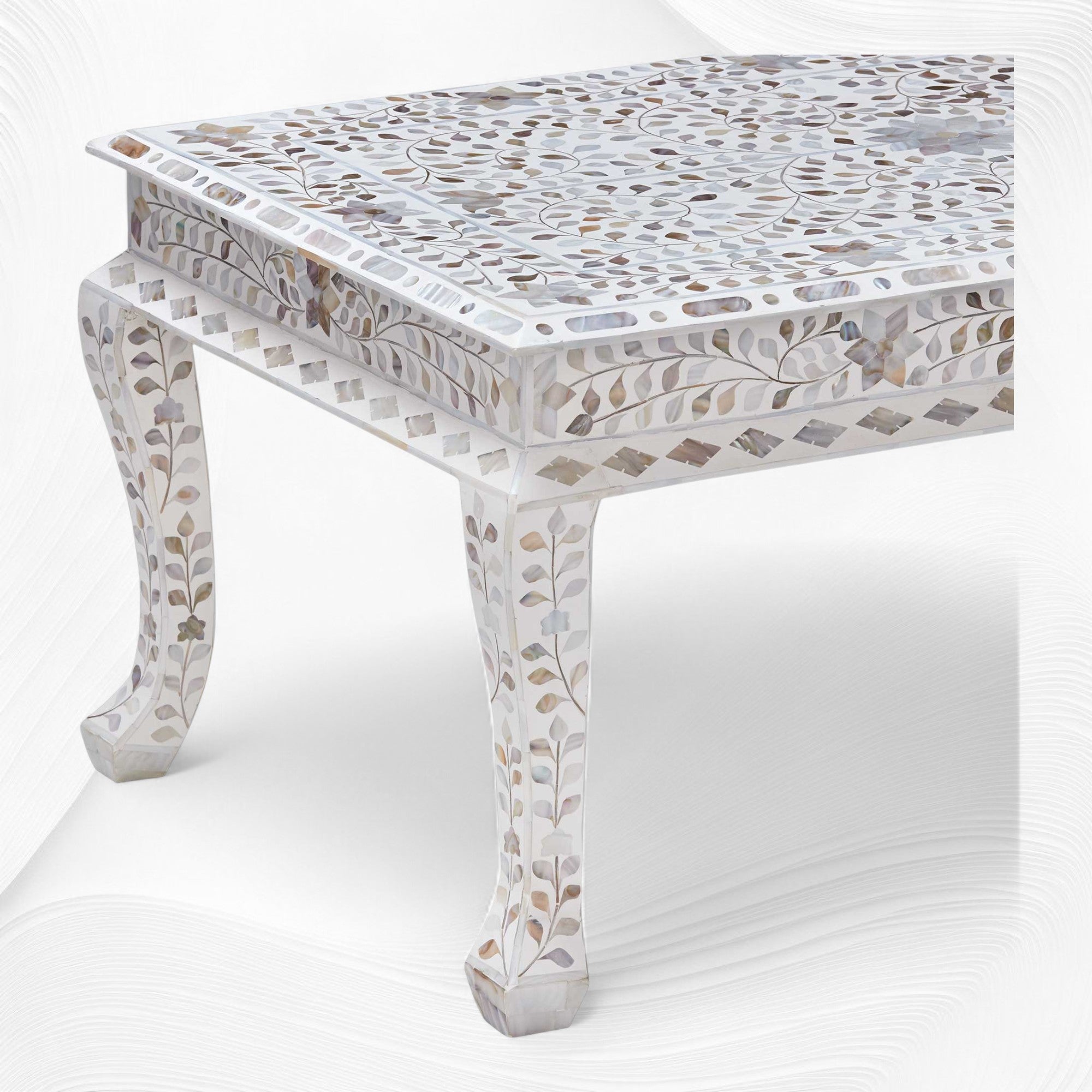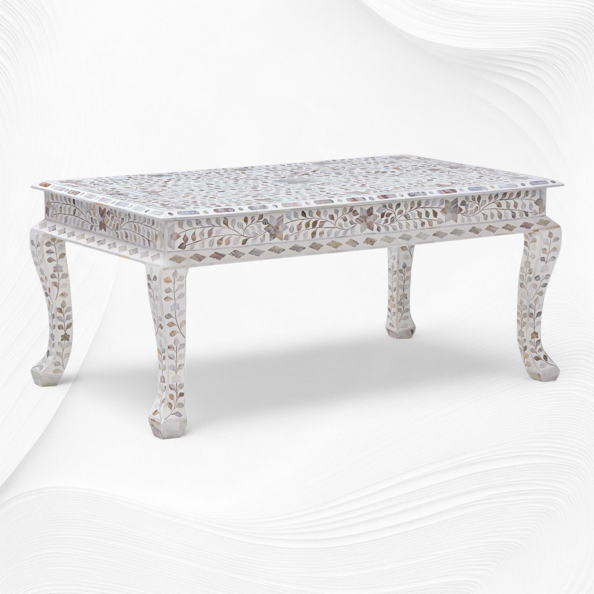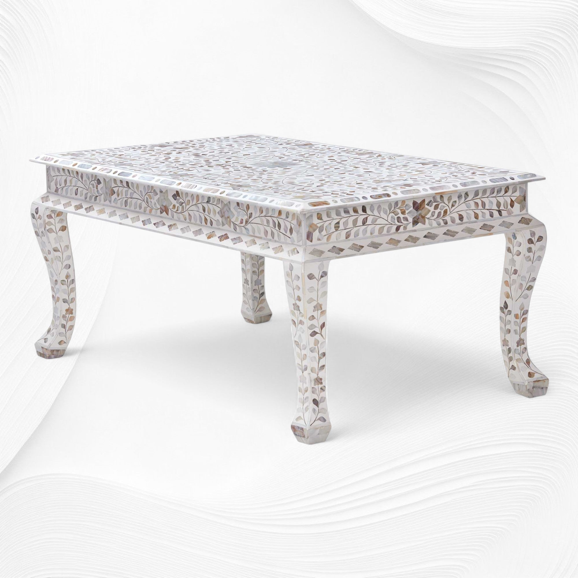 With truly stunning craftsmanship this beautiful mother of pearl inlaid coffee table boasts a wonderfully intricate design that packs some serious wow factor. Its white on white design is simple and sophisticated and oozes character from its curvaceous base and bone inlay heritage.