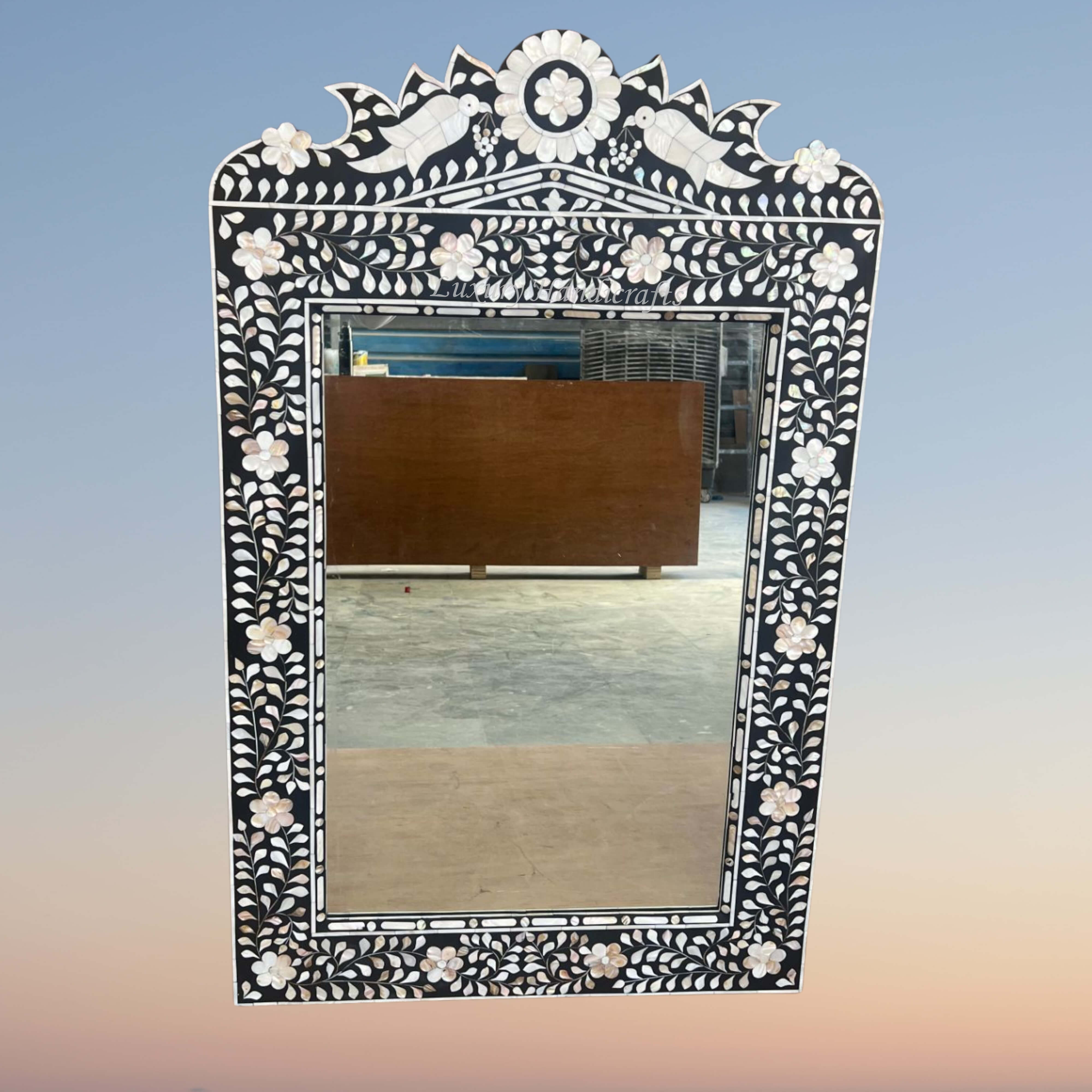A classic artistic piece by Luxury Handicrafts, this black bird mother of pearl inlay mirror is an excellent example of authentic Indian craftsmanship. Featuring elegant mosaics of birds surrounded by floral designs, this authentic Indian dressing table mirror would make a bold addition to any room.