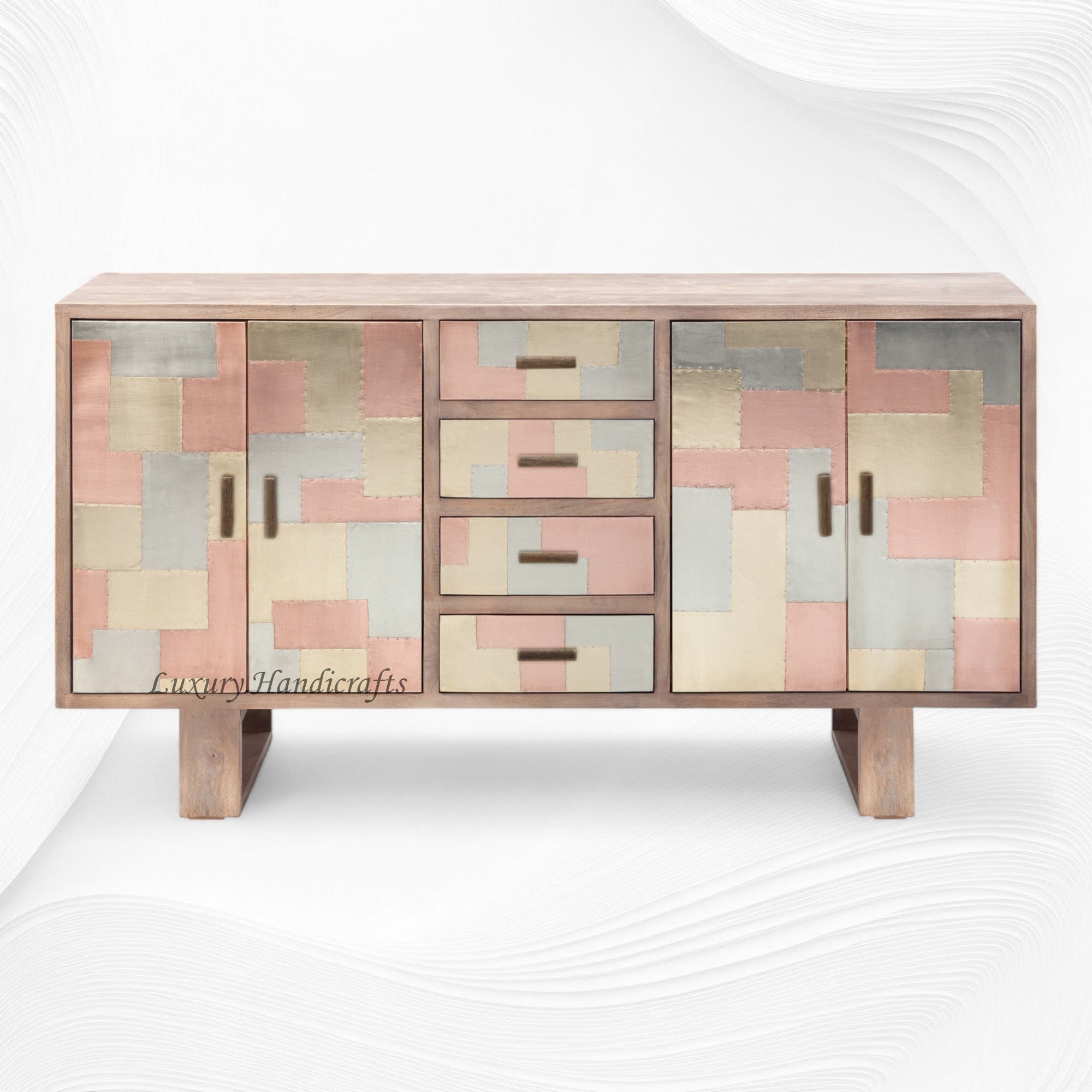 This Stunning hand made Cabinet by Luxury Handicrafts with multiple metals like Brass, Copper and white Metal embossed is a masterpiece. Doors and drawers been coated with metal, beautiful craftsmanship.