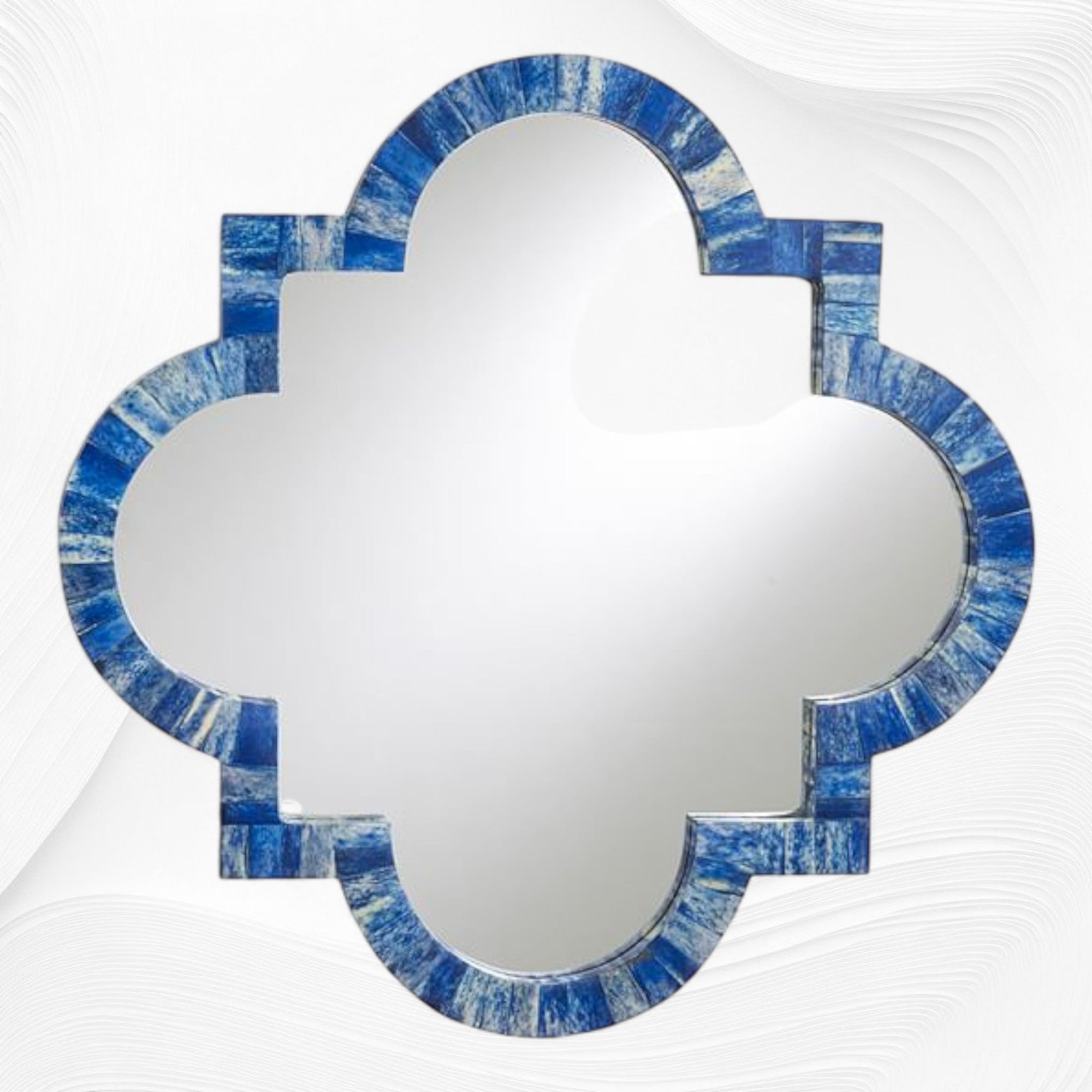 Add an exotic element to your home with this stunning Indian Colored Quatrefoil Bone Inlay Mirror in Dark Blue. This mirror has a beautiful frame made from natural bone inlay pieces colored in Dark Blue color.