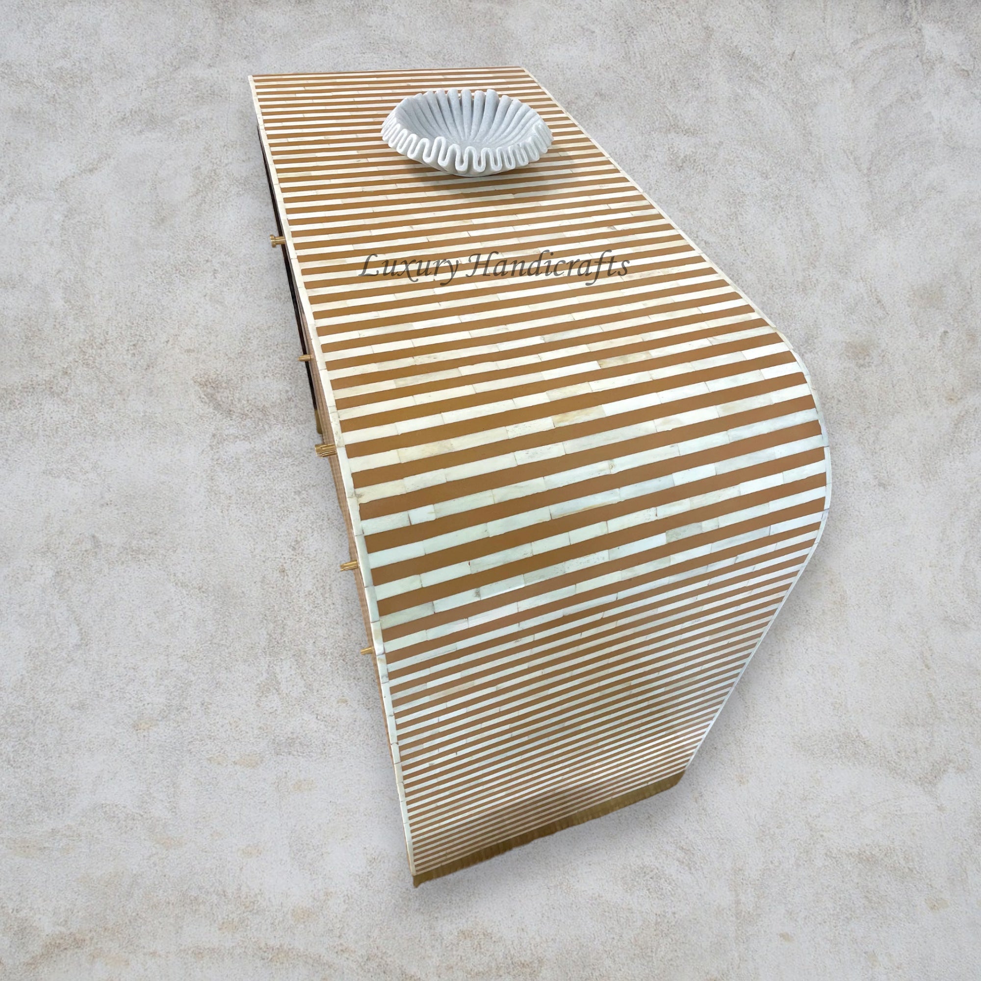 Our Bone Inlay 4 Drawers waterfall chest in stripe design is made from a high quality combination of wood, MDF, bone and resin. It features 4 drawers with curved design, stylish stripe finish with contrasting resin and intricate inlay detail. This piece is perfect for adding a timeless yet modern and unique statement to any home.